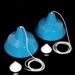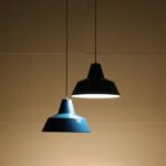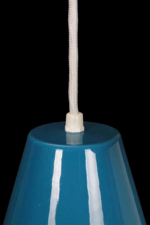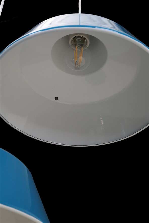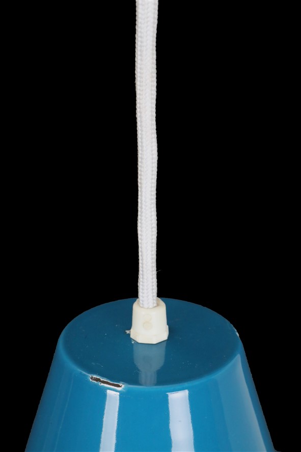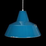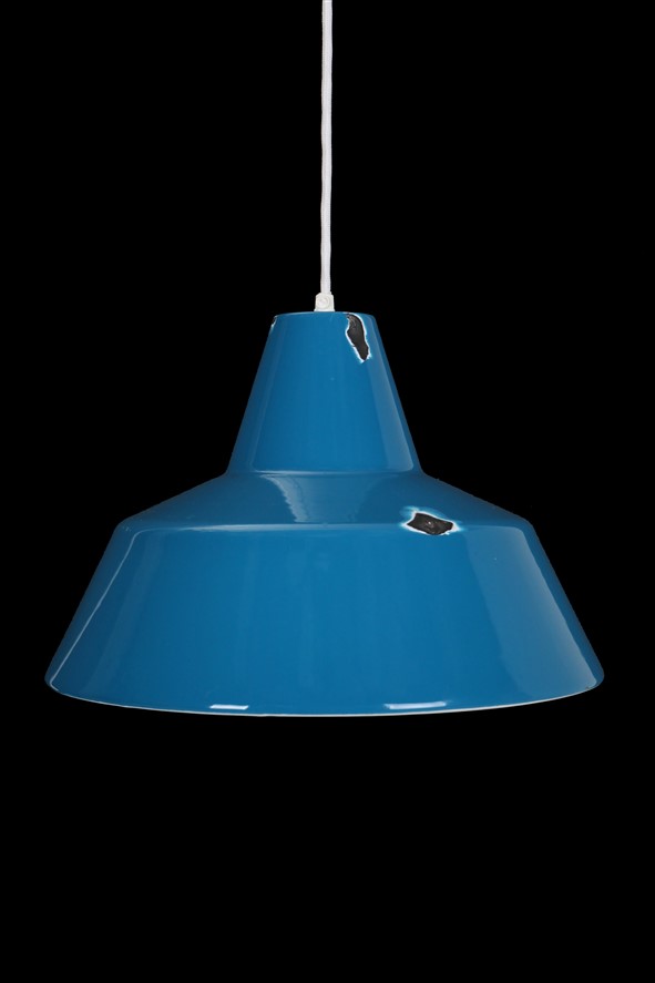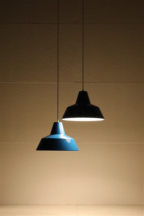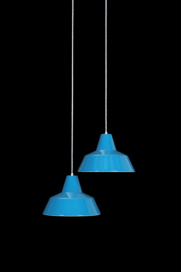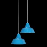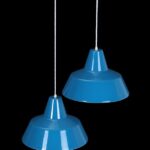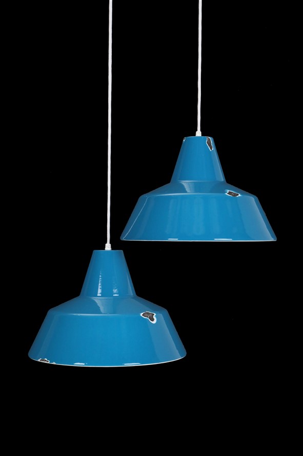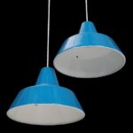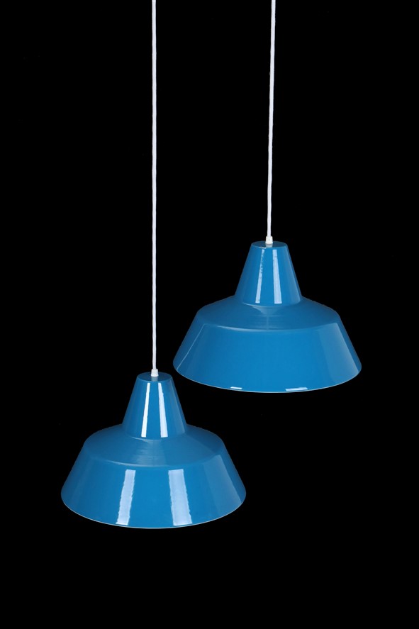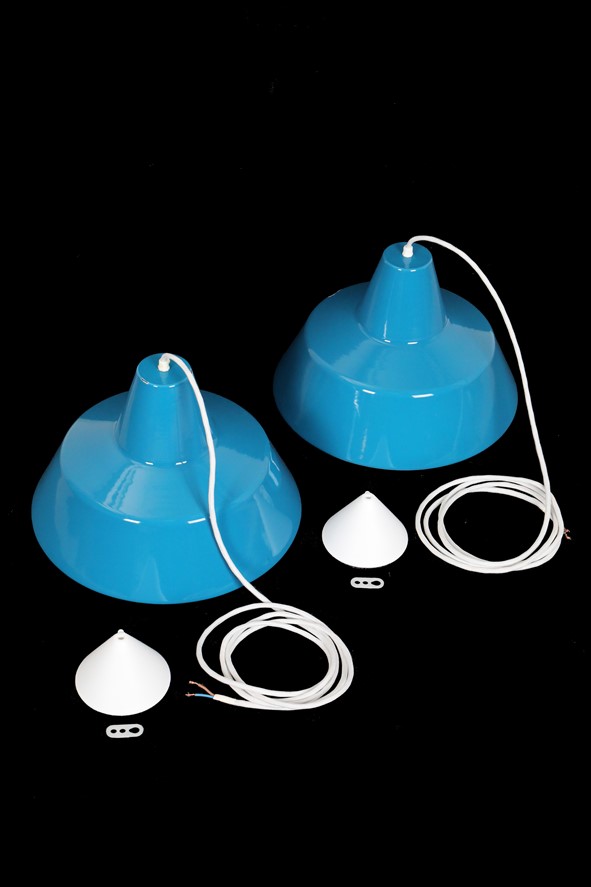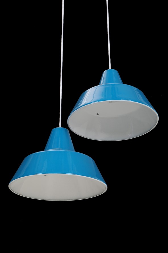 Set of 2 blue Louis Poulsen / Axel Wedel Madsen enamel pendant lamps / “Arbejdspendel” / workshop lamp / industrial design / mid-century / 1960s-1970s