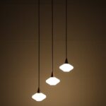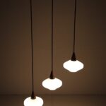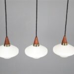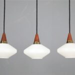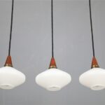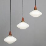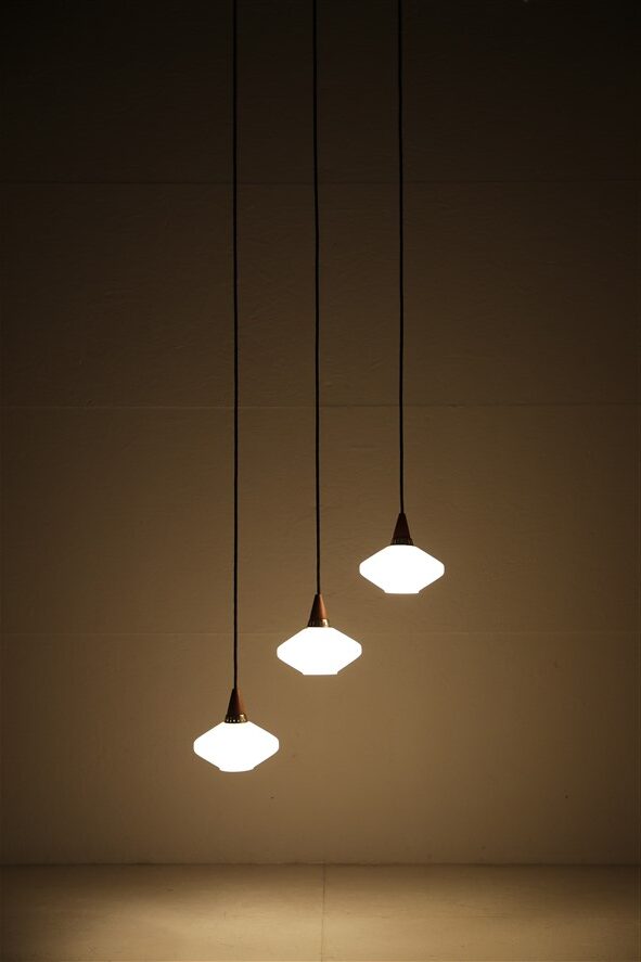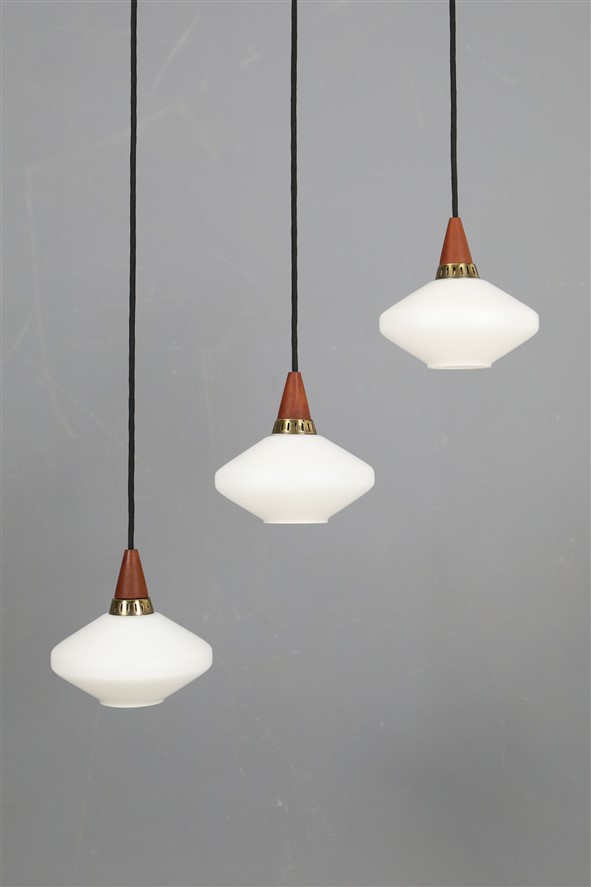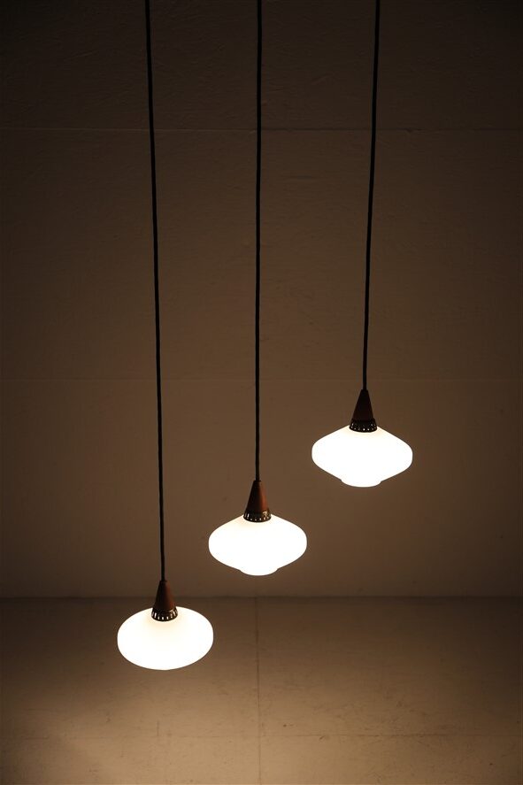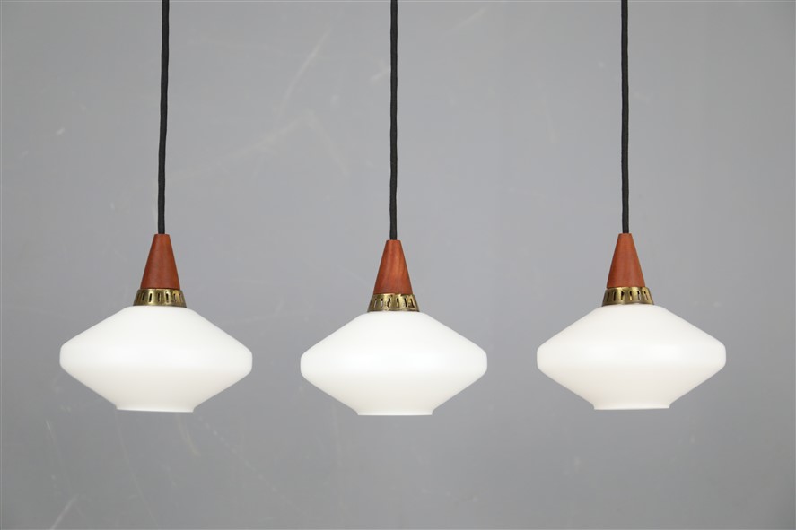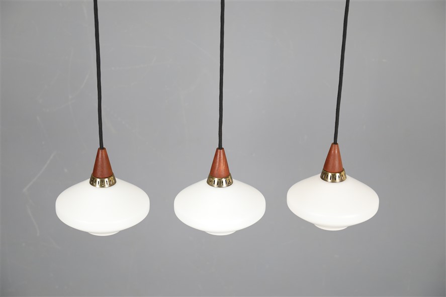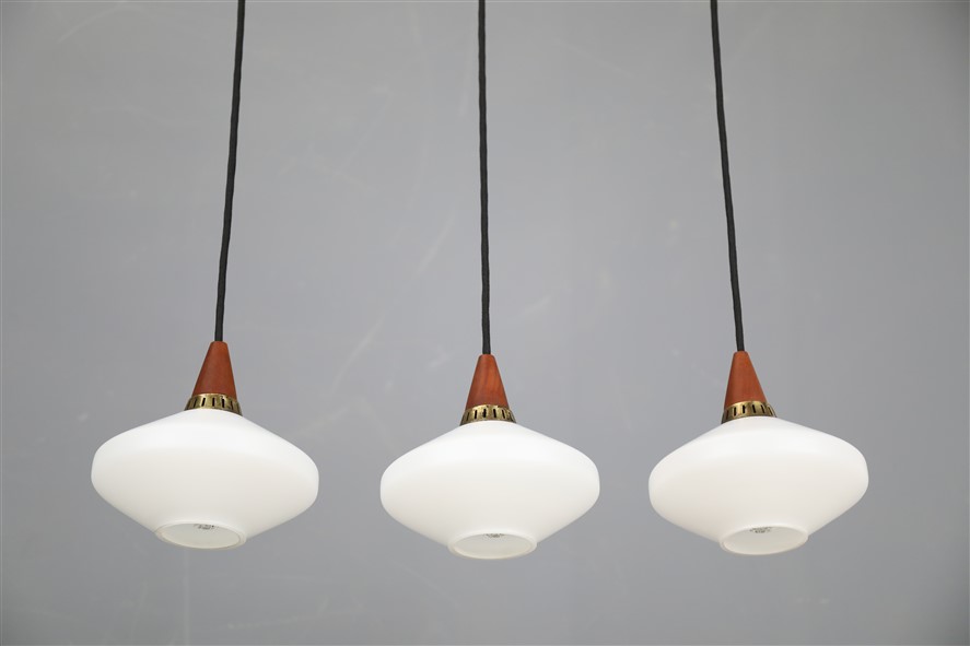 Set of 3 teak / glass pendant lamps / Mid-century Danish modern design / 1960s
