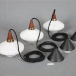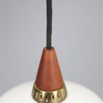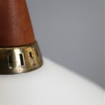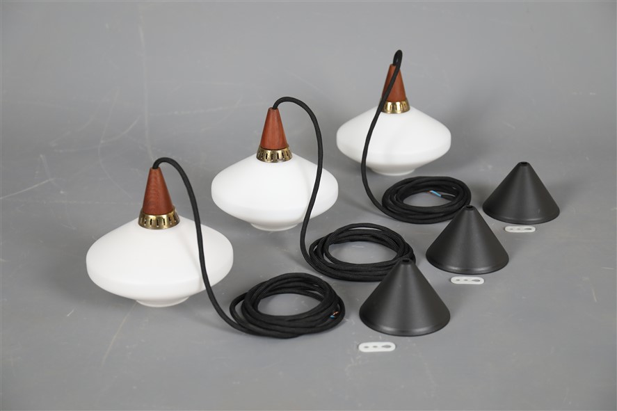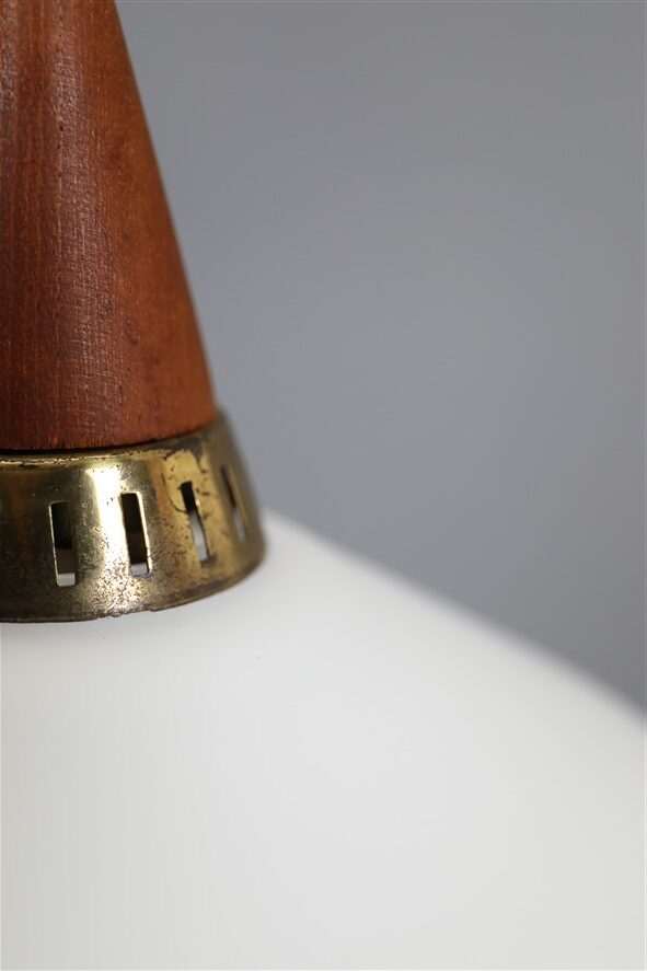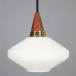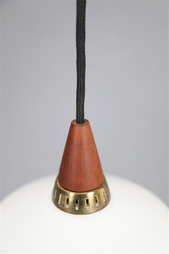 1960s, Denmark. Materials: white opaline glass, teak wood, brass. Dimensions: approx. 17 x 18 cm (height, diameter). The lamps are suitable for use with classic and modern (LED) E14 bulbs (110-250V, worldwide use). Each lamp comes with 2.40 m high-quality textile cord, energy-saving 230V LED bulb in warm white, ceiling cup, and cord grip for ceiling mounting. Used items. Despite their age, there are only a few signs of wear and tear. See close-up photos. No defects. These are the original photos of the items for sale. Nevertheless, colors may vary slightly as they are displayed differently on different devices/screens.