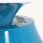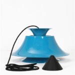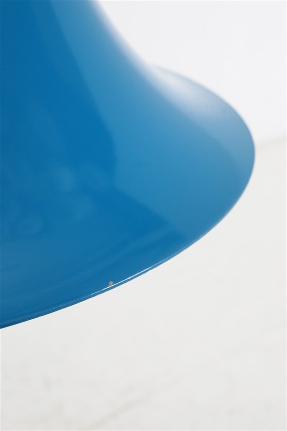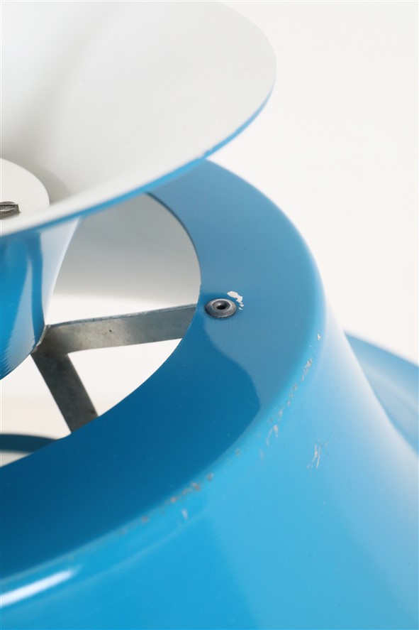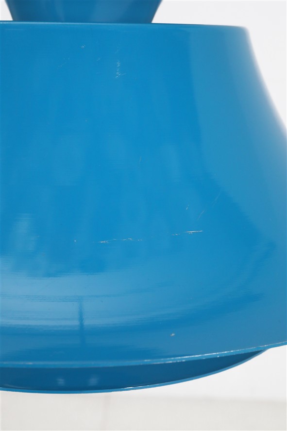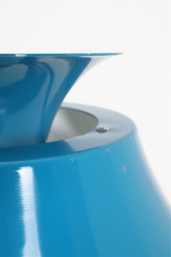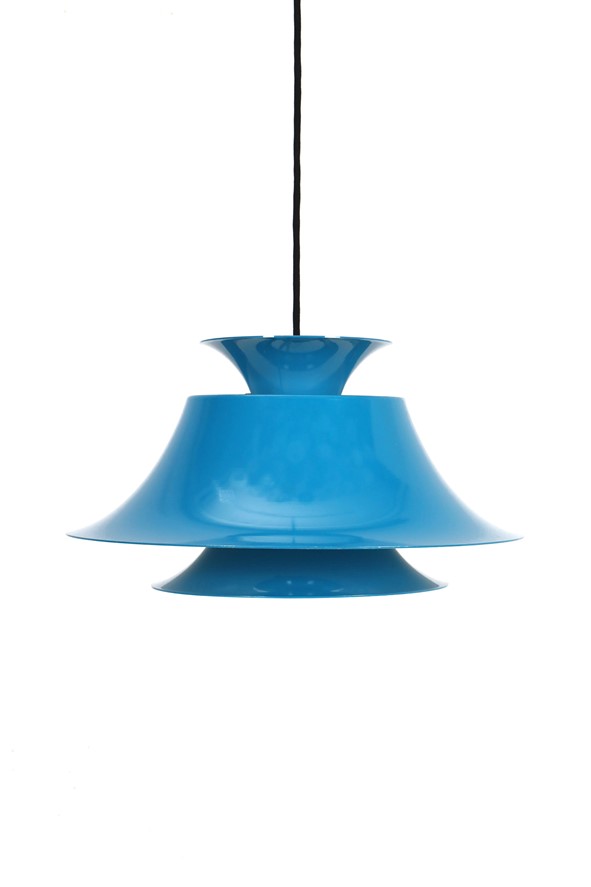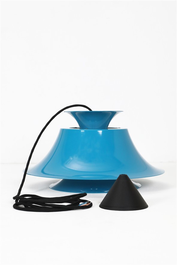 Fog & Mørup, Denmark, design: Erik Balslev, 1970s. Material: aluminum, steel. Original blue lacquer. Overall dimensions: approx. 22 x 40 cm (height, diameter). The lamp is suitable for use with classic and modern (LED) E27 bulbs (110-250V, worldwide use). Includes 2.40m high-quality, soft textile cord, energy-saving LED bulb in warm white, ceiling cup and cord grip for ceiling mounting. Used item. No defects. Only a few slight signs of use in the form of some paint abrasion on the lampshade. See close-up photos. These are the original photos of the items for sale. However, colors may vary slightly as they are displayed differently on different devices/screens.