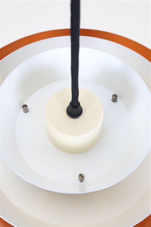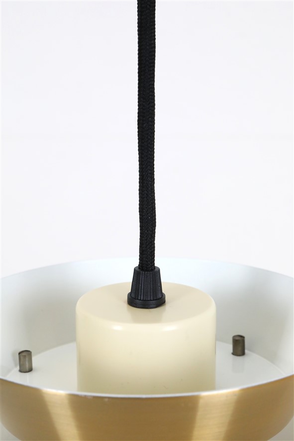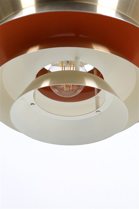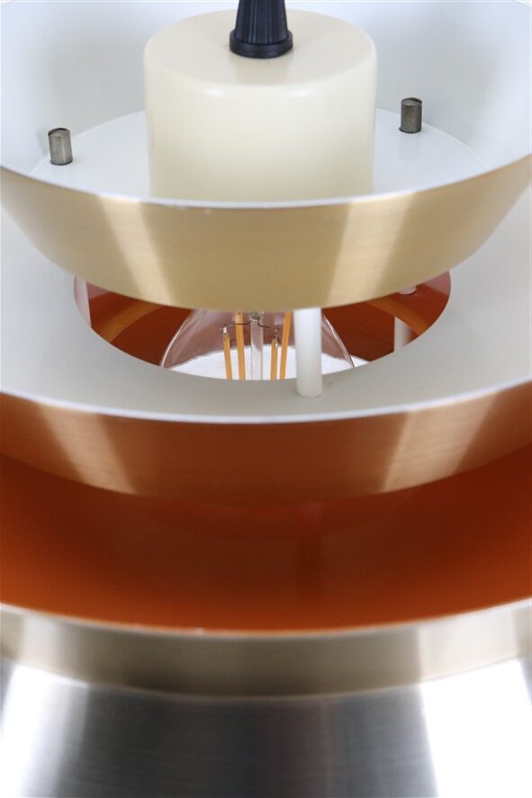 1960s/1970s Granhaga, design: Carl Thore, Sweden. Aluminum lamp shade, brass-colored anodized on the outside, painted white and orange on the inside. E27 standard socket (110-250V, can be used worldwide). Overall dimensions: approx. 19 x 30cm (height, diameter). The lamp is suitable for use with classic and modern (LED) E27 bulbs. Includes approx. 2.40 m high-quality, soft textile cord, warm white LED bulb, ceiling cup and cord grip for ceiling mounting. Used item. Minimal signs of wear despite its age. See close-up photos. No dents, no bends, no defects. These are the original photos of the items for sale. However, colors may vary slightly as they are displayed differently on different devices/screens.
