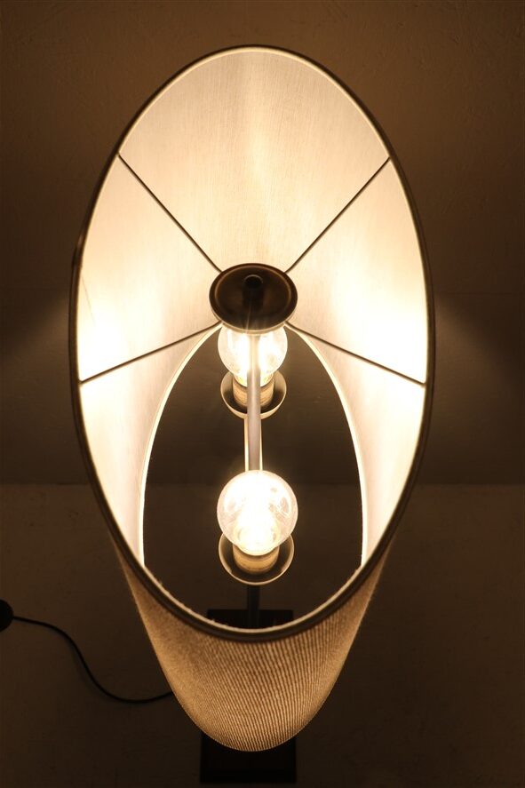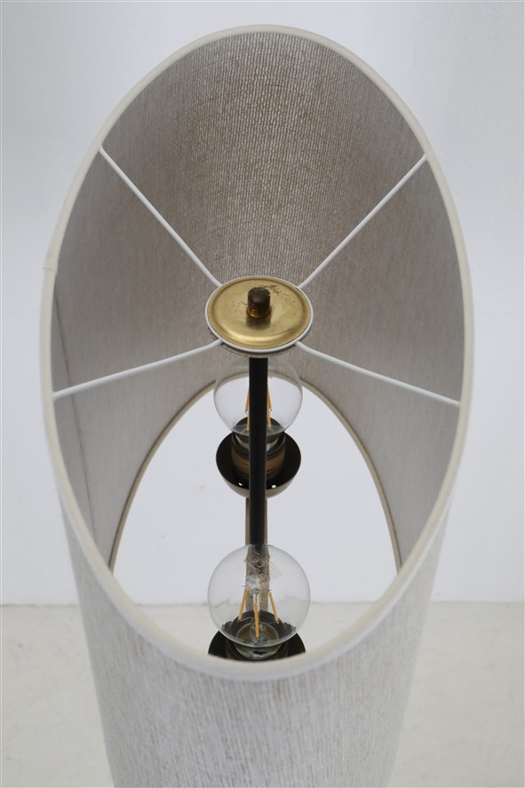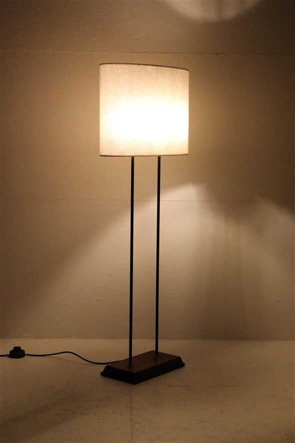 1960s, Denmark. Materials: solid teak, steel, brass, and heavy cast iron at the base (making it very stable). Replaced high quality lamp shade. Overall dimensions: approx. 115 x 45 x 21 cm (height, width, depth). This lamp is suitable for both classic and modern (LED) light bulbs. Comes with: 2x E27 light bulb sockets (110-250V), two energy-saving LED bulbs in warm white, foot switch, European bakelite plug. Used item. Very good condition. Only a few signs of age/use. A small flaw in the black coating of one of the metal struts. See close-up photo. These are the original photos of the items for sale. However, colors may vary slightly as they are displayed differently on different devices/screens.