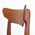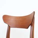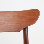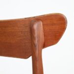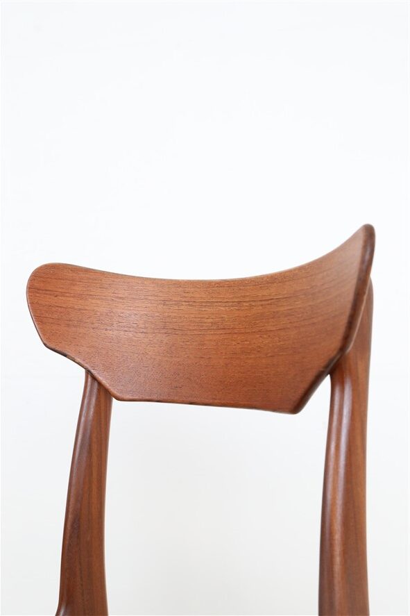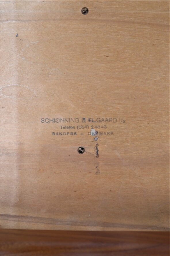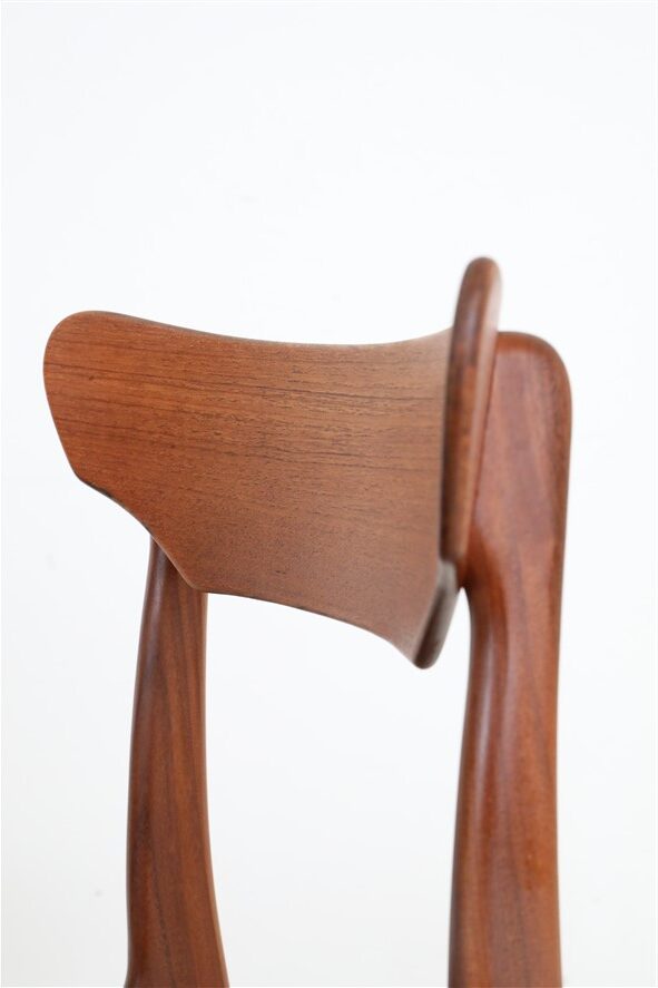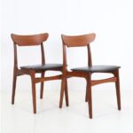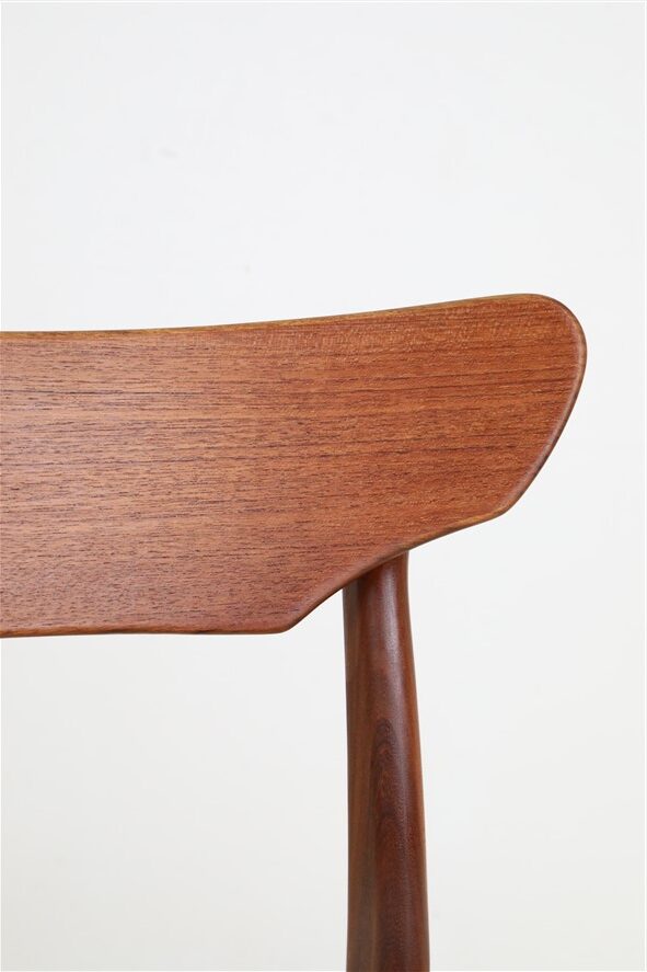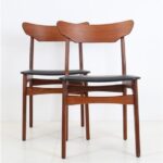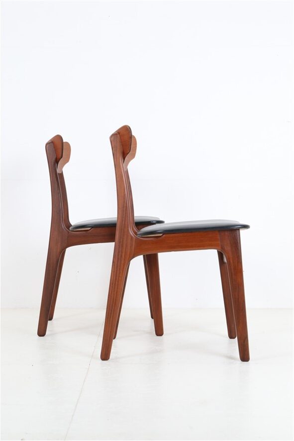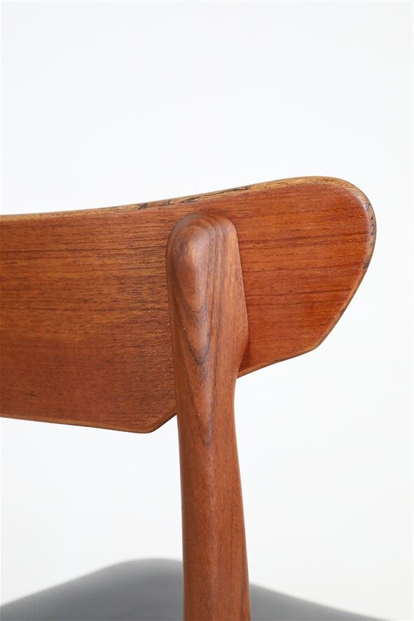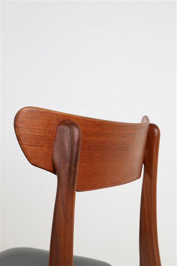 1960s Schiønning & Elgaard teak chair. Misattributions are often found in connection with this manufacturer. In this case, however, these are originals. See logo stamp. Very high-quality workmanship. The teak frames have been restored (cleaned, sanded, resealed). Very pleasant, smooth surfaces. The original upholstery with black Skai covers is unrestored but still in good condition for its age. The seat foam has softened over the decades. Dimensions: approx. 78 x 48 x 51 cm (height, width, depth). Seat height: approx. 45 cm. Used items. Only slight signs of wear. These are the original photos of the items for sale. However, the colors may vary slightly as they are displayed differently on different devices/screens.