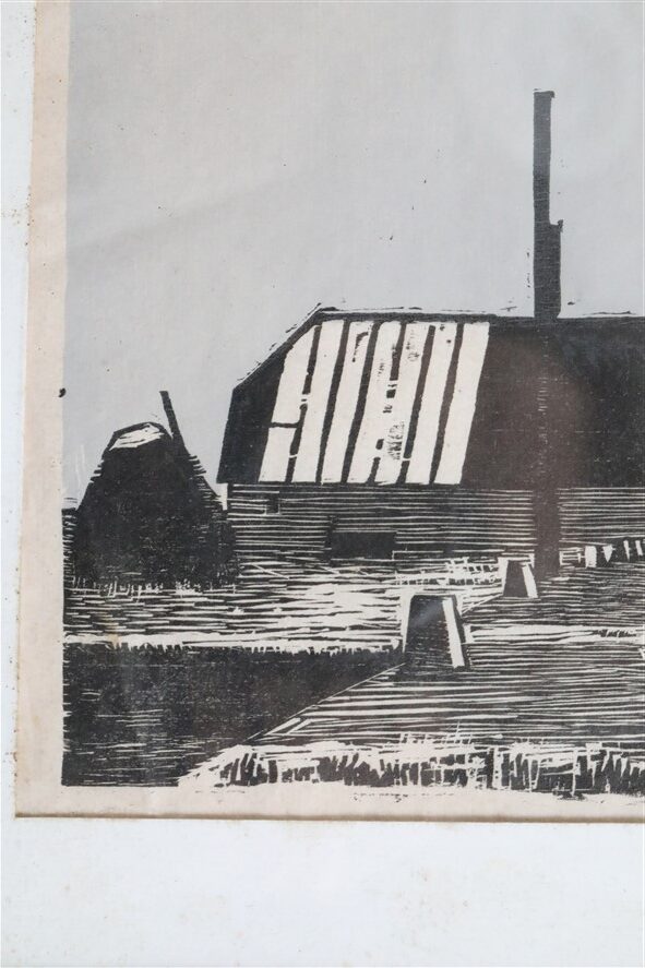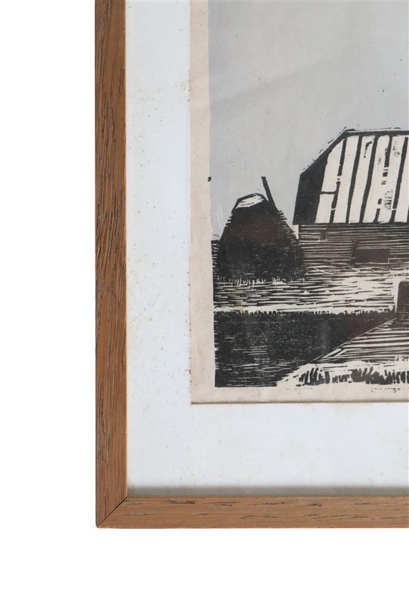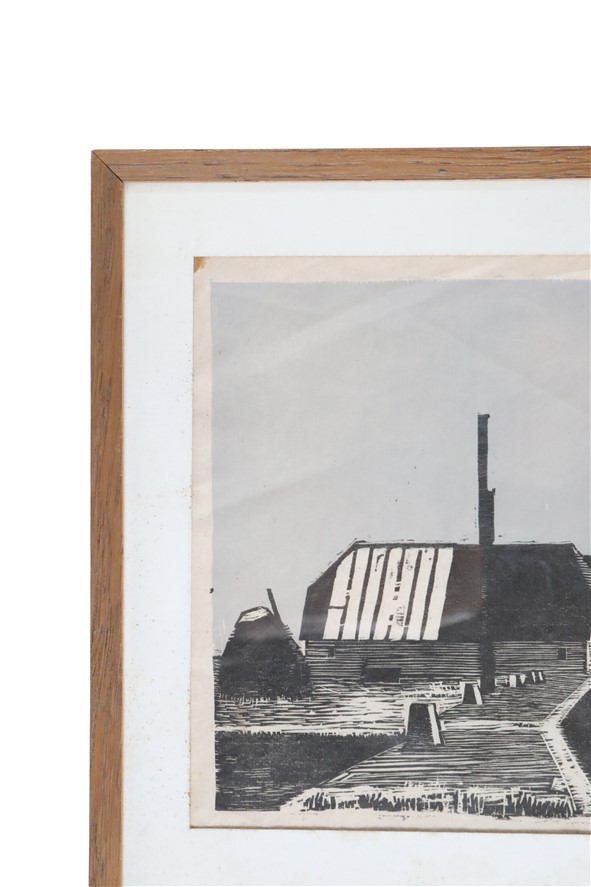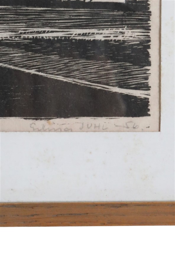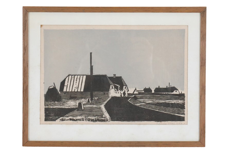 Artist: Erling Juhl (1923-1990, Denmark). Rare original woodcut print from 1956. Hand-signed. In original oak frame with real glass. Overall dimensions approx.: 23.5 x 30.5 x 1 cm (height, width, depth). Used item. Some signs of ageing/wear commensurate with age. Patinated paper. See photos. Colours may vary as each device/display shows colours differently.
