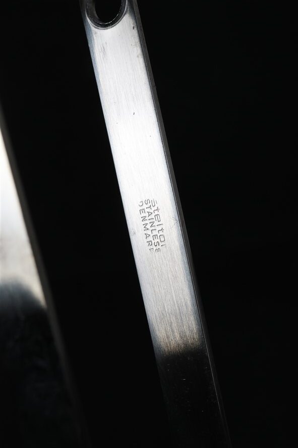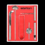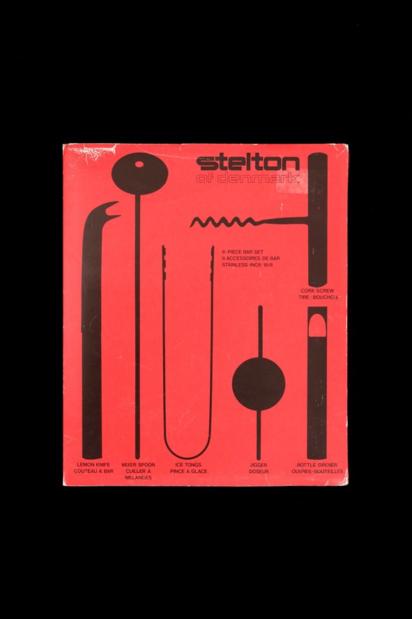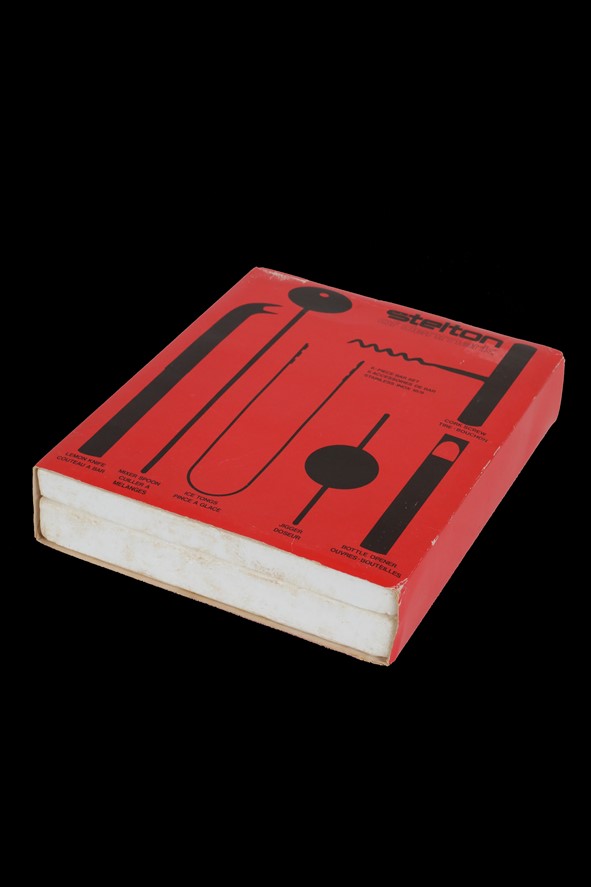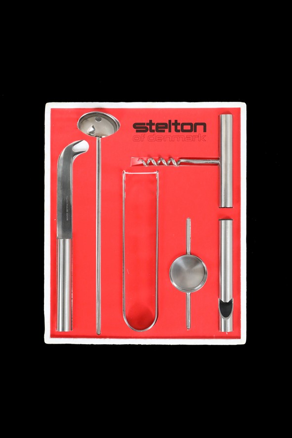 Rare 6-piece bar/cocktail set by Stelton. Vintage version from the 1970s. Ice tongs and mixing spoon designed by Arne Jacobsen; bottle opener, corkscrew, measuring cup, and fruit knife designed by Peter Holmblad. Stainless steel. Unused in original packaging (with slight signs of storage on the cardboard, see photos). Perfect for collectors or as a gift for friends of timeless Danish design. Box dimensions: approx. 26.5 x 22 x 5.2 cm (height, width, depth).