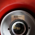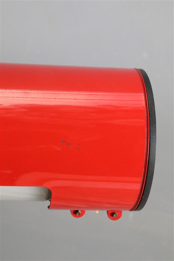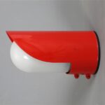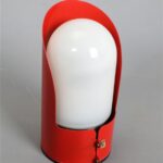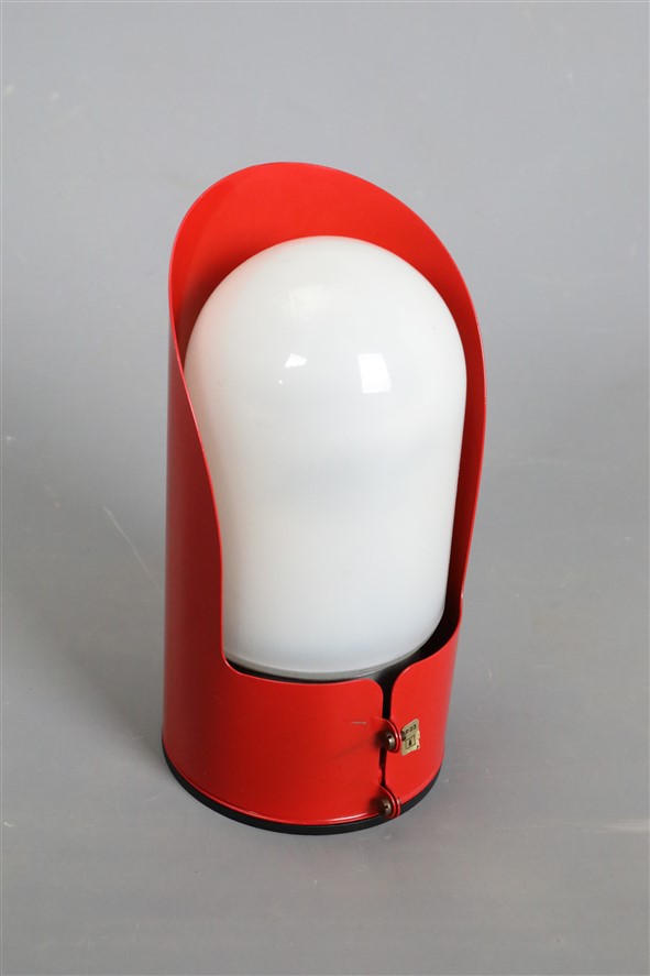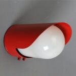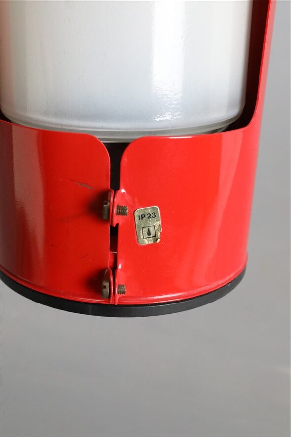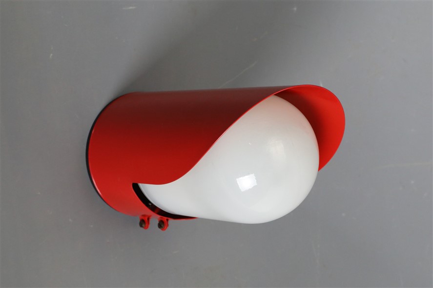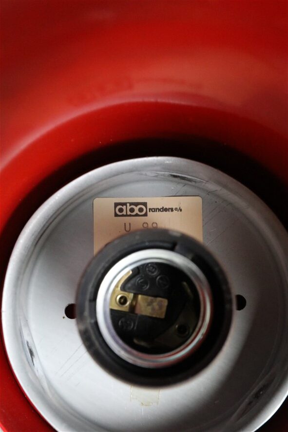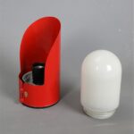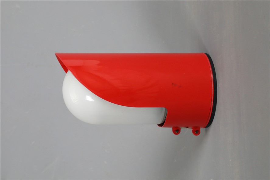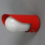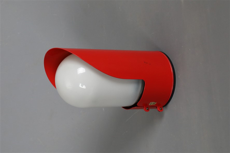ABO Randers, Denmark, type “U 99” Space Age wall lamp, 1970s. Approved for indoor and outdoor use (IP 23). Material: sheet steel, opaline glass, plastic. Original paint in red. Overall dimensions: approx. 11 x 11 x 22 cm (height, width, depth). The lamp is suitable for use with classic and modern (LED) E27 bulbs (110-250V, worldwide use). Used item. No defects. Only a few slight signs of use in the form of minimal paint abrasion on the lampshade. See close-up photos. These are the original photos of the items for sale. Nevertheless, colors may vary slightly as they are displayed differently on different devices/screens.
