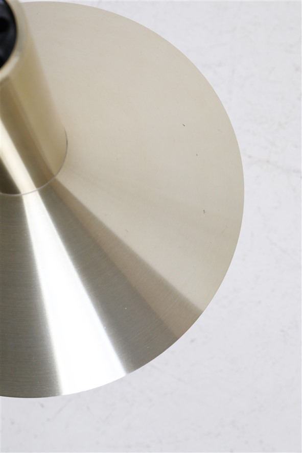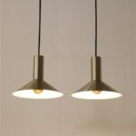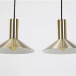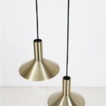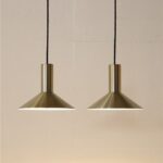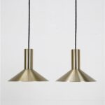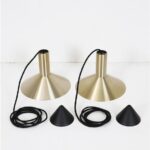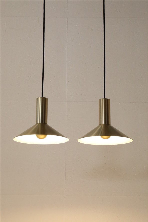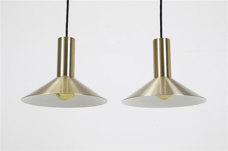 Fog & Mørup „Formel 1“. Design: Hans Due, 70er-Jahre, Dänemark, gebürstetes Aluminium, in eher seltenem Messing/Gold-Finish eloxiert. Sammelwürdig: Mit Original-F&M-Aufklebern. Maße: ca. 20,5 x 26cm (Höhe, Durchmesser). E27-Fassung (110-250V, weltweit anwendbar). Beiden Leuchten kommen mit hochwertigem, weichem Textilkabel (ca. 2,40m), goldfarbener Kopfspiegel-LED-Glühbirne (230V, warmweiß), Zugentlaster zur Deckenmontage und Baldachin. Gebrauchtware. Angesichts des Alters sehr guter Zustand. Keine Defekte. Nur leichte Alterungs-/Gebrauchsspuren. Siehe Nachaufnahmen. Die mit abgebildete größere „Formel 2“-Leuchte ist nicht Bestandteil dieses Angebots und kann zusätzlich erworben werden (so lange verfügbar). Dies sind die Originalbilder der zum Verkauf stehenden Artikel. Trotzdem können die Farben leicht variieren, da sie auf verschiedenen Geräten / Bildschirmen unterschiedlich dargestellt werden.