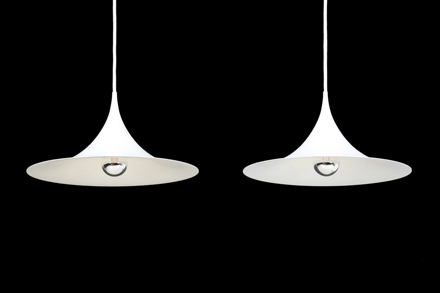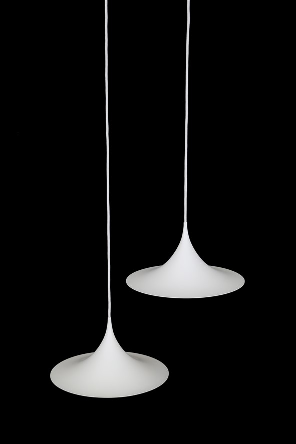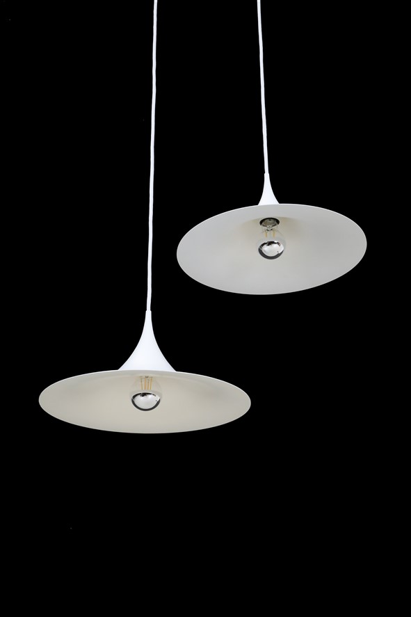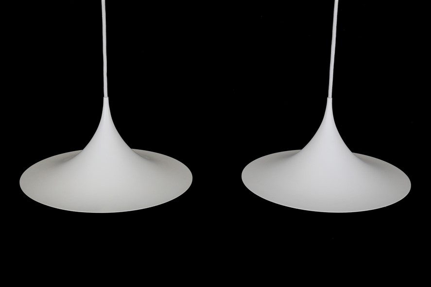 Torsten Thorup & Claus Bonderup “Semi”. Eher seltene 38cm-Durchmesser-Version. Entwurf: 1967, Dänemark. Keine (Gubi-) Neuauflage! Alte Fog & Mørup Produktion. Selten: Einer der originalen F&M-Papier-Sticker ist noch erhalten. Maße: jeweils ca. 19 x 38cm (Höhe, Durchmesser). Aluminium. Jeweils inklusive ca. 2,40m Textilkabel, 240V-LED-Kopfspiegel-Leuchtmittel in warmweiß, Zugentlaster zum Aufhängen und Baldachin. Diese Lampen sind für die Verwendung mit klassischen und modernen (LED) E27-Glühbirnen (110-250V) geeignet. Gebrauchtware. Angesichts des Alters nur wenige Gebrauchsspuren. Nicht verbogen, keine Beulen, Keine Kratzer, keine Defekte! Siehe Fotos. Die Farben können variieren, da jedes Gerät/Display die Farben anders darstellt.