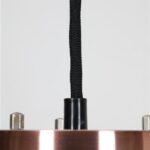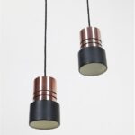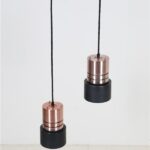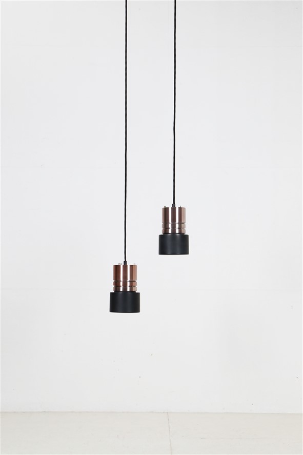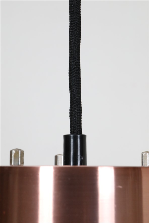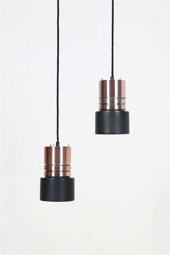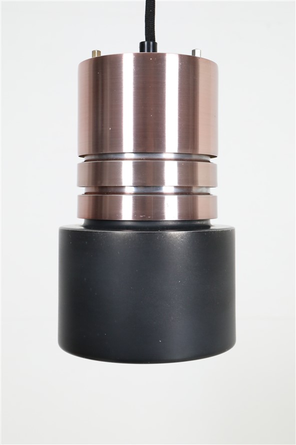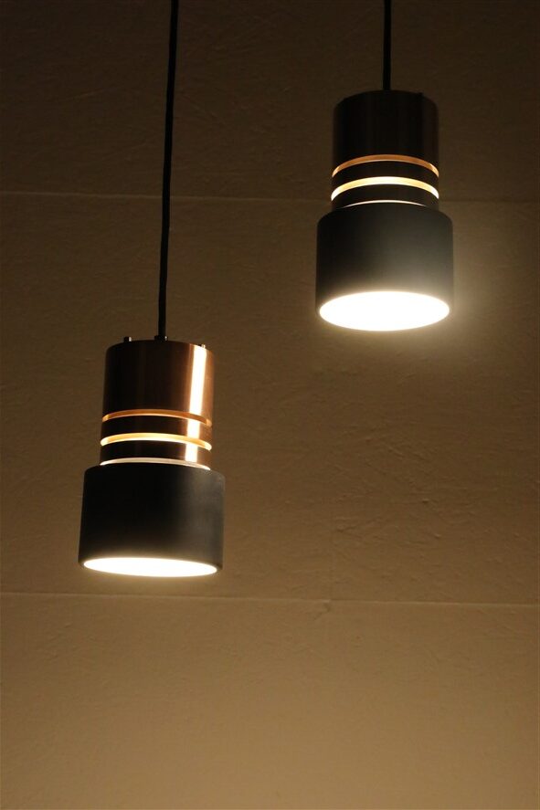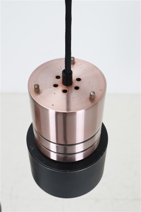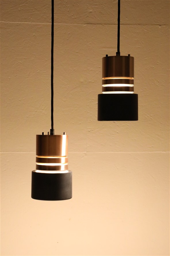 1960er-1970er, Dänemark. Aluminiumschirme, außen kupferfarben eloxiert, schwarz lackiert (Original-Lack). Maße ca. 20 x 12,5cm (Höhe, Durchmesser). E27-Bakelit-Fassung (110-250V, weltweit anwendbar). Die Lampen eignen sich für den Gebrauch mit klassischen und modernen (LED-) Glühbirnen. Beide Leuchten kommen jeweils inklusive ca. 2,40m hochwertigem, weichem Textilkabel, 230V-LED-Glühbirne in warmweiß, Zugentlaster zur Deckenmontage und Baldachin. Gebrauchtware. Wegen des Alters ein paar Alterungs- / Gebrauchsspuren / Vintage-Patina. Siehe Nahaufnahmen. Nicht verbogen, keine Dellen, keine Kratzer, keine Defekte. Die Eloxierung der Leuchten ist bei einer der beiden Leuchten etwas stärker verblichen. Siehe Fotos. Dies sind die Originalfotos der zum Verkauf stehenden Artikel. Trotzdem können die Farben leicht variieren, da sie auf verschiedenen Geräten / Bildschirmen unterschiedlich dargestellt werden.