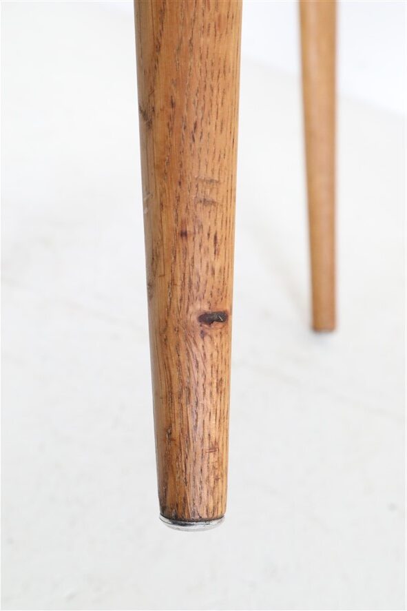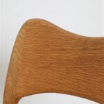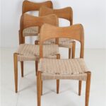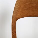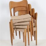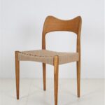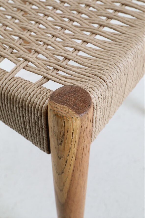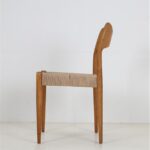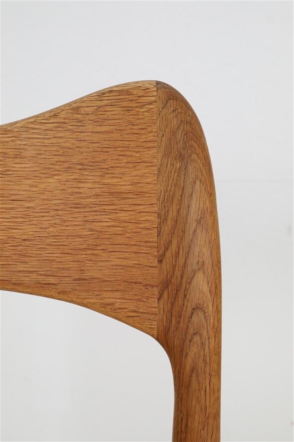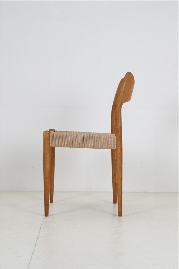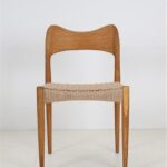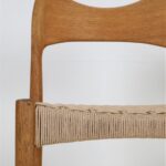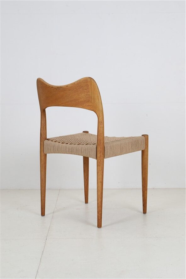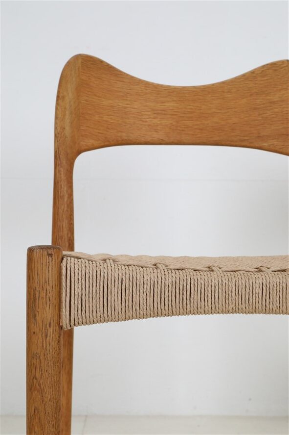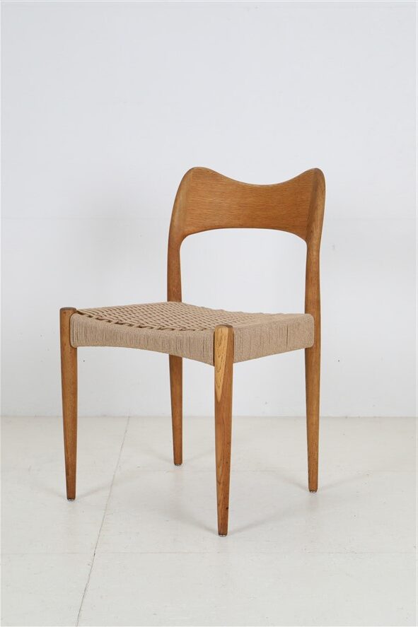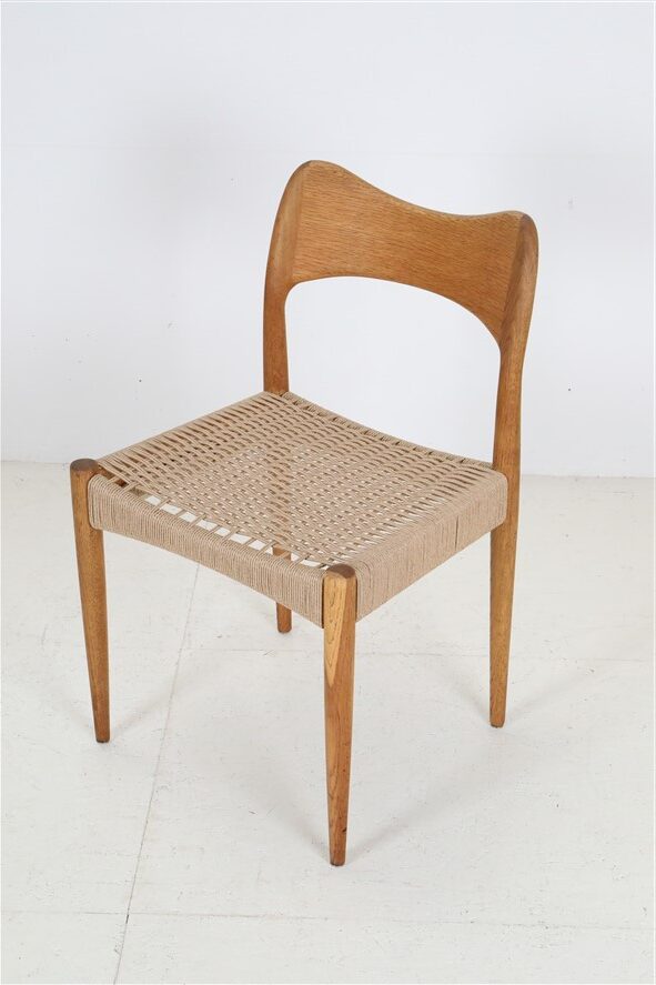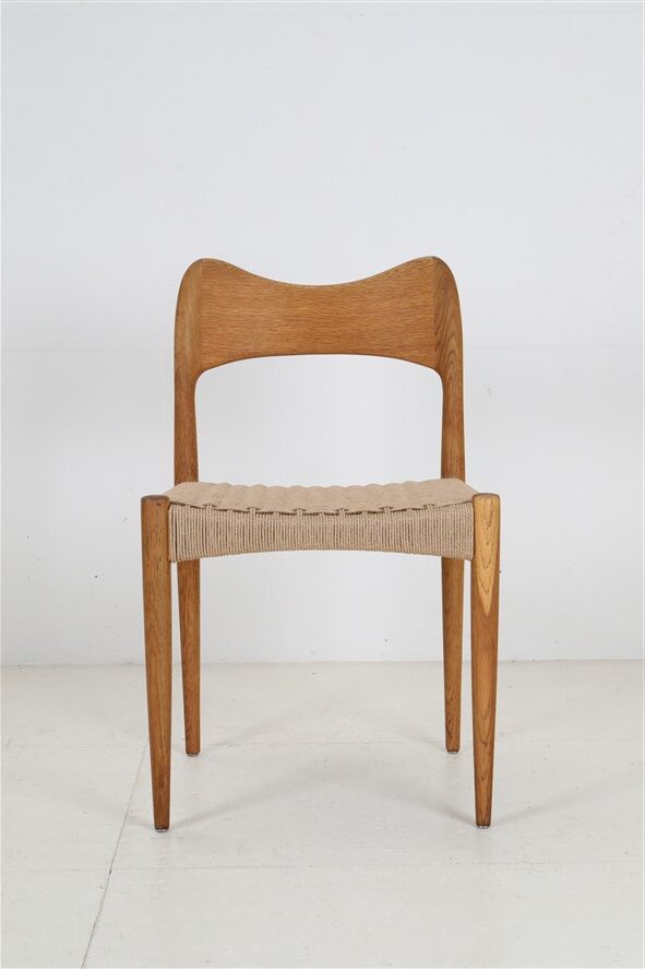1960er-1970er-Jahre, Hersteller: Mogens Kold, Design: Arne Hovmand Olsen, Dänemark. Sehr aufwändige Vollrestauration. Die Eichenholzgestelle wurden schonend angeschliffen und Öl/Wachs-versiegelt. Geschmeidige, seidenmatte Oberflächen. Die Sitzflächen sind von einem Profi komplett neu mit authentischem Papercord geflochten worden. Gesamtmaße jeweils ca: 79 x 48 x 51cm (Höhe, Breite, Tiefe), Sitzhöhe: ca. 44cm. Gebrauchtware. Durch die Restauration nur sehr wenige Gebrauchsspuren. Siehe Fotos. Dies sind die Original-Fotos der zum Verkauf stehenden Artikel. Trotzdem können die Farben leicht variieren, da sie auf verschiedenen Geräten / Bildschirmen unterschiedlich dargestellt werden. Der abgebildete Esstisch ist nicht Bestandteil dieses Angebots, steht aber auch zum Verkauf und passt sehr gut zu den Stühlen.