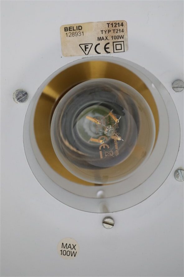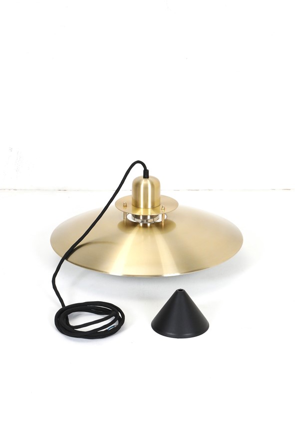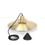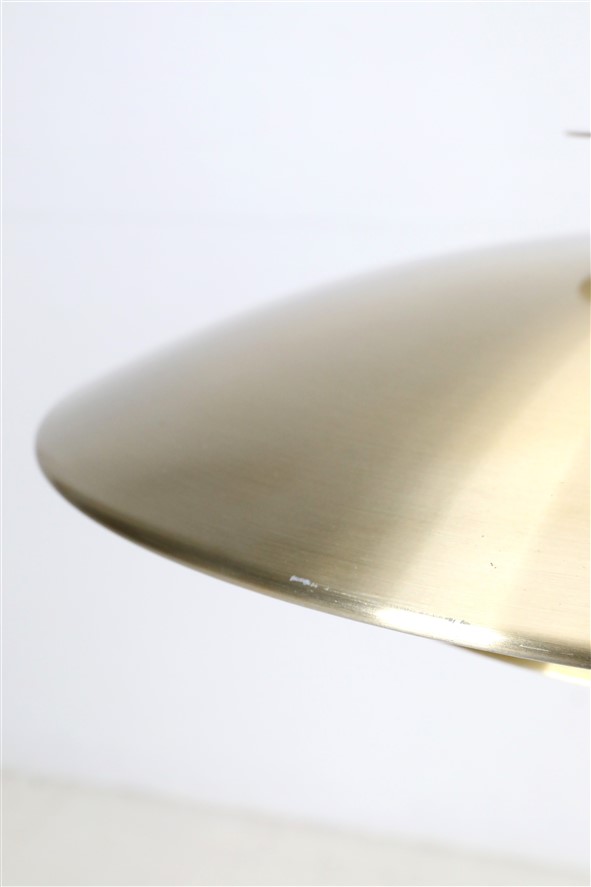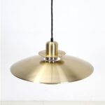 1980er-Jahre, Belid „Typ T214“, Schweden. Gebürstetes Aluminium, gold-/messingfarben eloxiert. Maße: ca. 43 x 21cm (Durchmesser, Höhe). Diese Leuchte eignet sich für den Gebrauch mit klassischen, aber auch mit modernen LED-Glühbirnen (110-250V, weltweit anwendbar). E27-Fassung aus Bakelit. Inklusive ca. 2,40m hochwertigem, weichem Textilkabel, 230V LED Leuchtmittel in warmweiß, Zugentlaster zum Aufhängen und Baldachin. Gebrauchtware. Nur wenige Gebrauchsspuren für das Alter. Siehe Fotos. Die Fotos sind Bestandteil der Beschreibung. Die Farben können variieren, da jedes Gerät/Display die Farben anders darstellt.