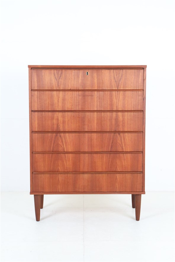 Große dänische Tallboy Kommode aus den 1950er-1960er-Jahren, Teak (Furnier und massive Teile). Mit Original-Schlüssel. Gesamtmaße ca: 105 x 77 x 41cm (Höhe, Breite, Tiefe). Gebrauchtware. Restauriert. Geschmeidige, seidenmatte Oberflächen. Angenehme Haptik. Nur wenige leichte Gebrauchsspuren. Ein paar sehr kleine Furnier-Reparaturen (ich verwende kein Wachs für Reparaturen!). Siehe Nahaufnahmen. Die Farben können variieren, da jedes Gerät/Display die Farben anders darstellt.