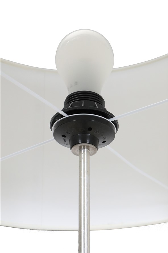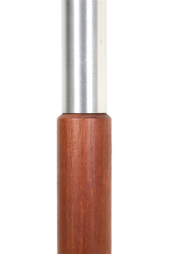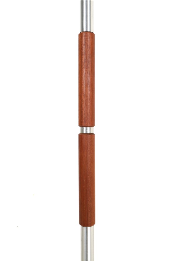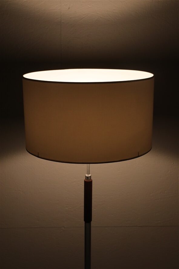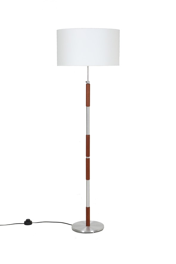 1960er/1970er Jahre, Dänemark, gebürstetes Aluminium, massives Teakholz. Hochwertiger neuer handgearbeiteter Lampenschirm (Leinwandbindung, Elfenbein-weiß), Durchmesser: 45cm. E27-Bakelit-Fassung (110-250V, weltweit anwendbar). Mit Fußschalter und europäischem Bakelit-Stecker. Kommt mit 230V-LED-Leuchtmittel in warmweiß. Stufenlos höhenverstellbar: 137 bis 172cm (erstes Foto: 150cm). Kabellänge ca. 230cm. Gebrauchtware. Leichte Alterungs- / Gebrauchsspuren. Keine Defekte. Siehe Fotos. Dies sind die Original-Fotos der zum Verkauf stehenden Artikel. Trotzdem können die Farben leicht variieren, da sie auf verschiedenen Geräten / Bildschirmen unterschiedlich dargestellt werden.