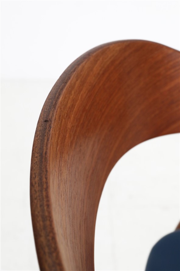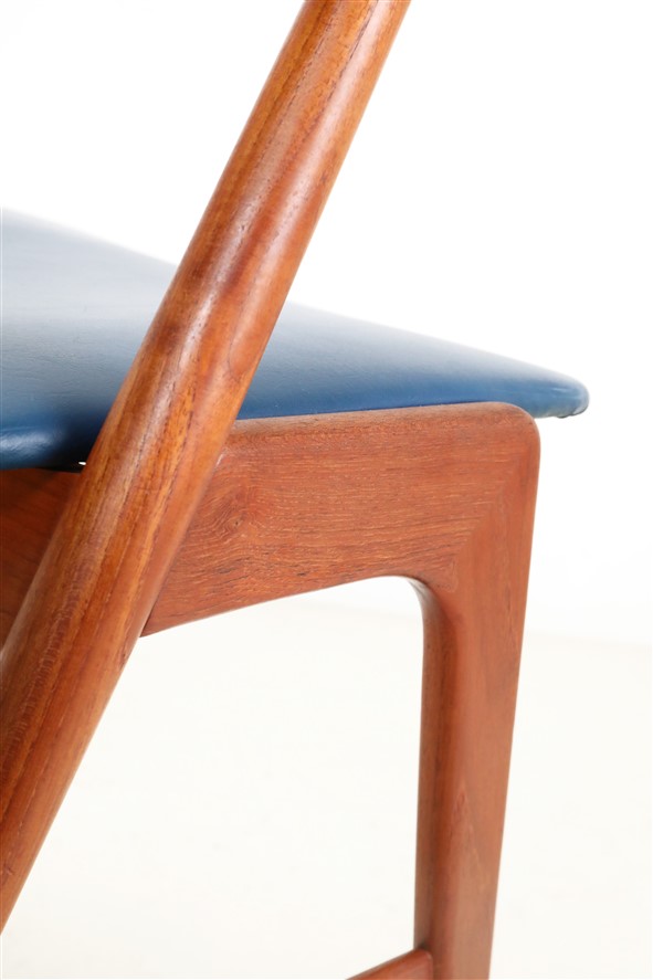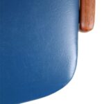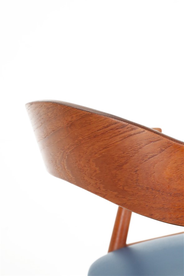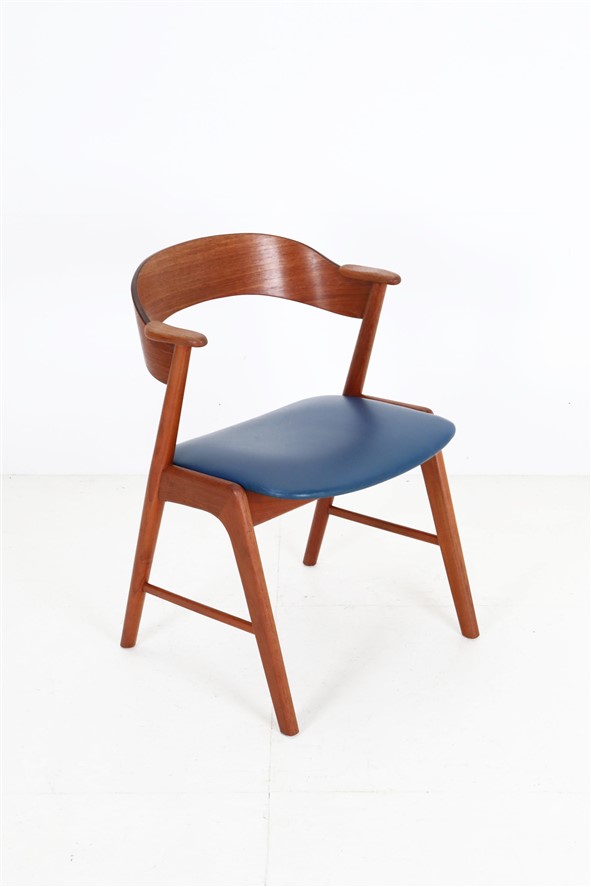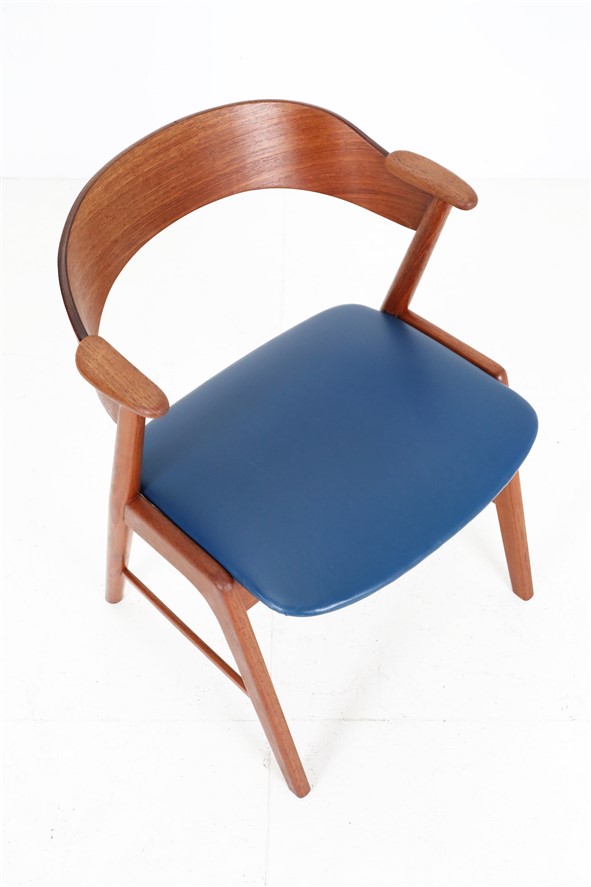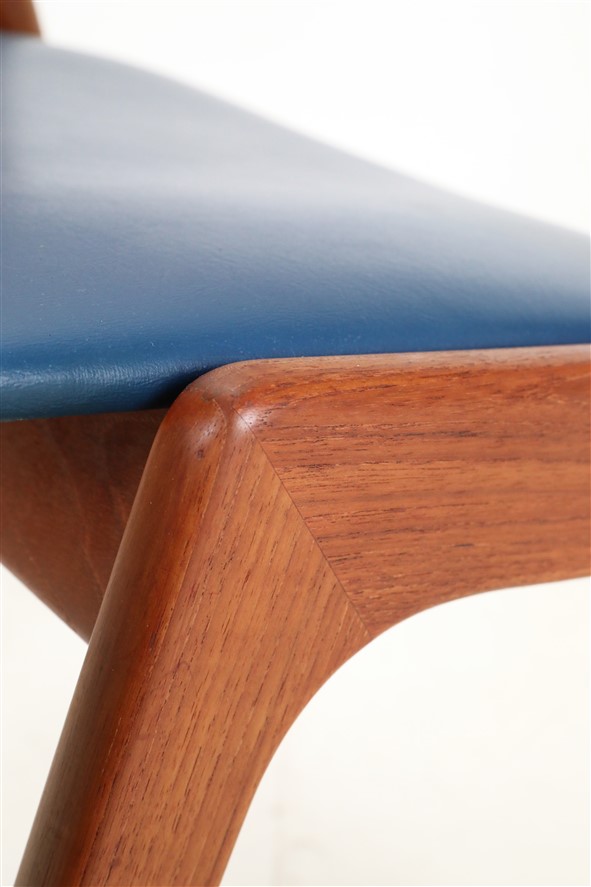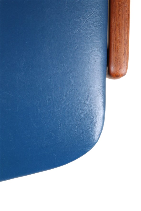 Eines der Glanzstücke des dänischen Mid-Century-Designs. Der „KS 21“-Stuhl von Korup Stolefabrik, Dänemark, 1960er-Jahre. Sehr hochwertig verarbeitet. Teakholz mit originalem Bezug aus Skai (sehr selten in diesem Blau-Ton). Maße: ca. 72 x 54 x 52cm (Höhe, Breite, Tiefe). Gebrauchtware. Seidenmatte Holz-Oberflächen, angenehme Haptik. Originaler Sitzbezug und Polster, daher ist der orginale Sitzschaum über die Jahrzehnte weicher geworden. Gebrauchtware in sehr gutem Zustand. Nur minimale Gebrauchsspuren. Siehe Fotos. Dies sind die Original-Fotos des zum Verkauf stehenden Artikels. Trotzdem können die Farben leicht variieren, da sie auf verschiedenen Geräten / Bildschirmen unterschiedlich dargestellt werden.