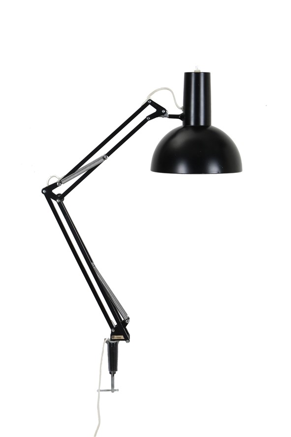 Louis Poulsen „IT“. Die klassische dänische Architektenleuchte. 1960er/1970er-Jahre, Dänemark. Mit Klemmfuß. Farbe: Schwarz. Materialien: Aluminium, Stahl. Kommt mit sparsamer LED-Glühbirne in warmweiß. Verstellbar in Größe, Neigung etc. Maße in Position wie auf Foto 1: ca. 74 x 50 x 21cm (Höhe, Breite, Tiefe). Kabellänge: ca. 2,45m. Gebrauchtware. Ein paar Gebrauchsspuren in Form von kleinen Macken am Lampenschirm. Siehe Nahaufnahmen. Keine Defekte. Dies sind die Original-Fotos der zum Verkauf stehenden Artikel. Trotzdem können die Farben leicht variieren, da sie auf verschiedenen Geräten / Bildschirmen unterschiedlich dargestellt werden.