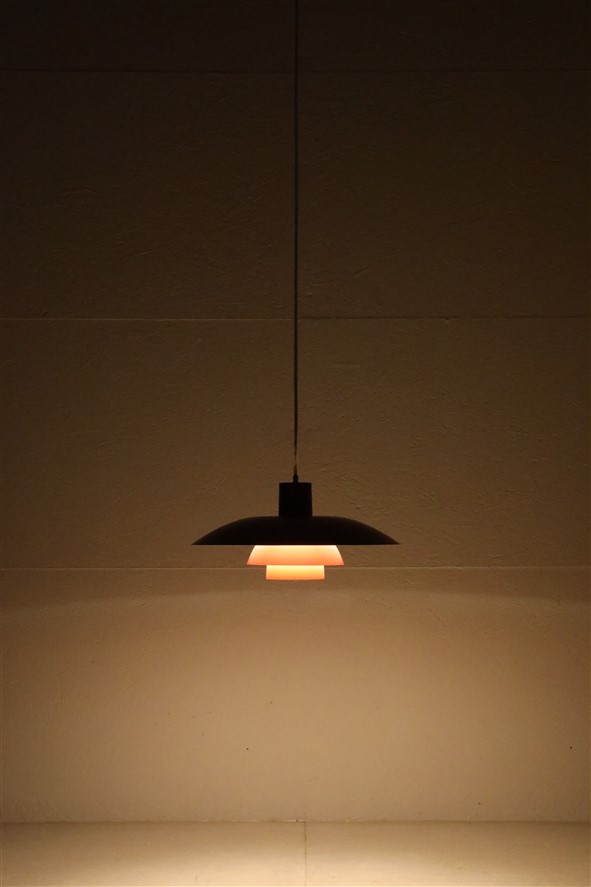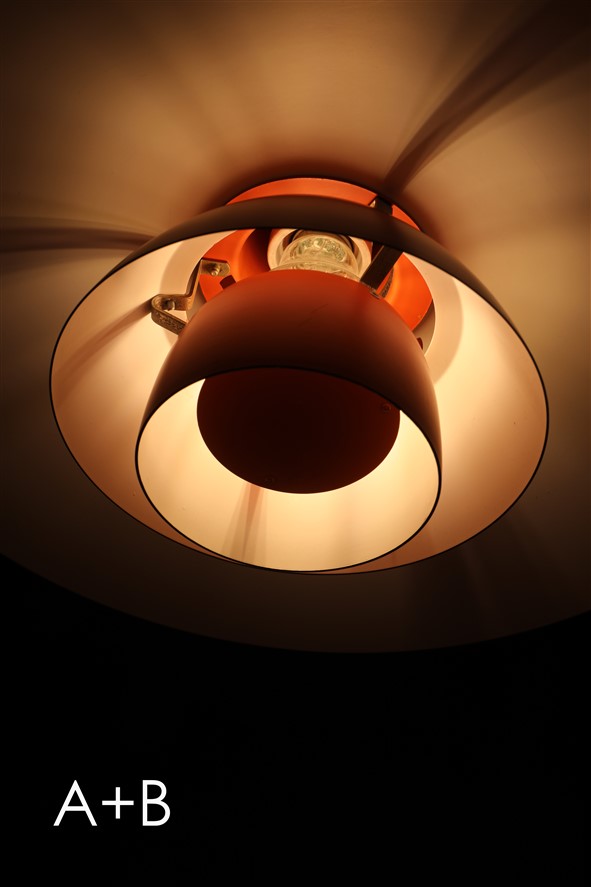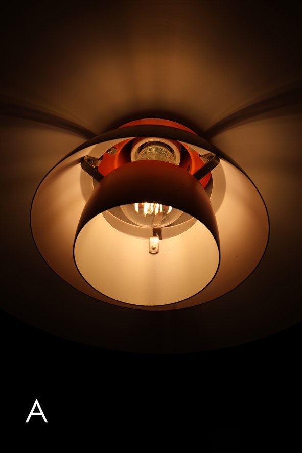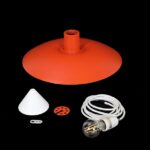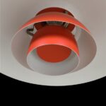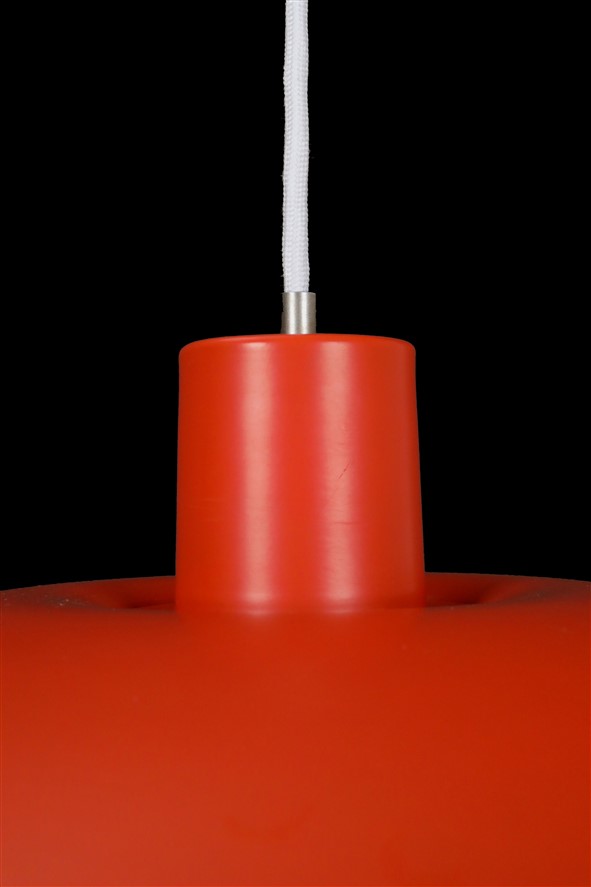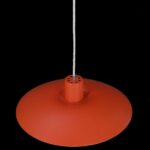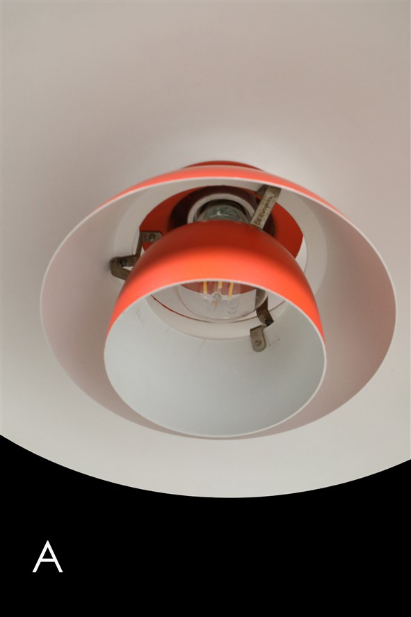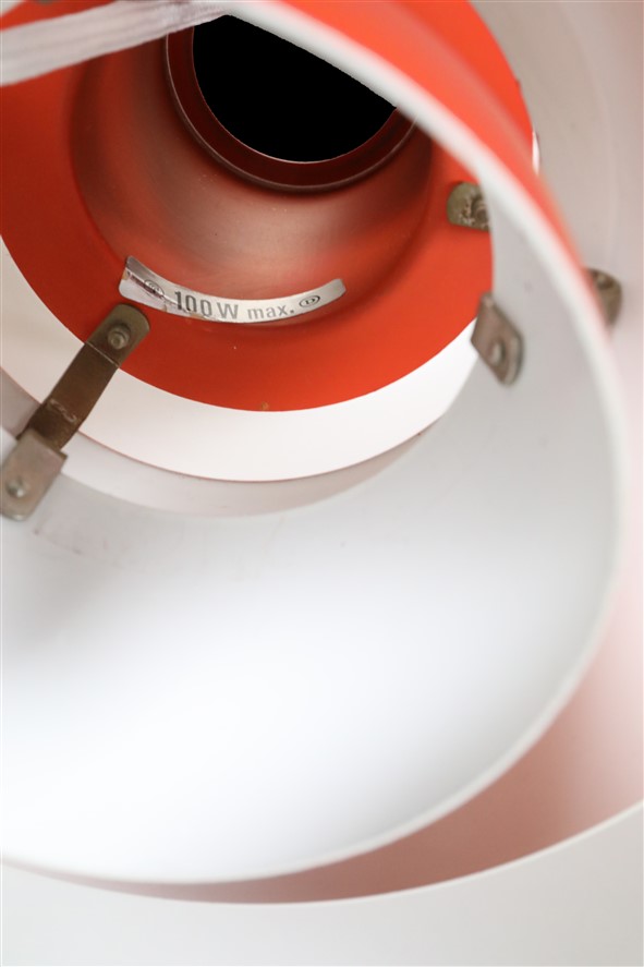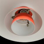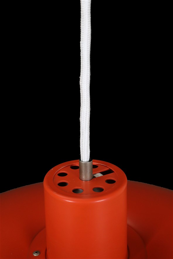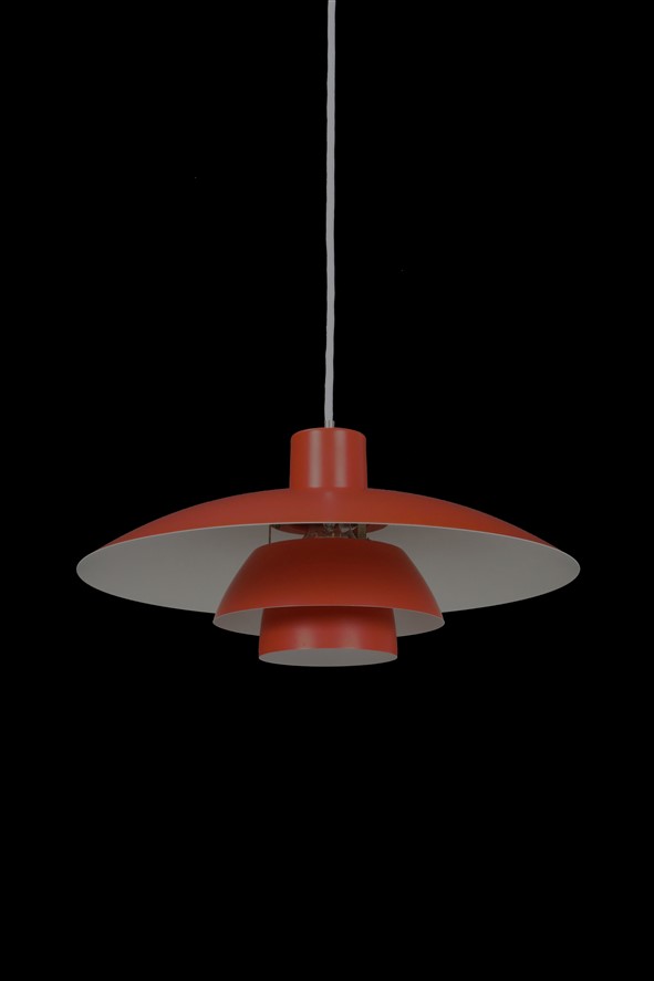 Louis Poulsen “PH 4-3”, Design: Poul Hennigsen, 1966, Dänemark. Farbe: rot-orange. In dieser Farbe ist dieses Modell sehr viel seltener als die weiße Ausführung. Aluminium. Durchmesser: 40cm. Diese Leuchte eignet sich für den Gebrauch mit klassischen und modernen LED-Energiespar-Birnen (E27, weltweit anwendbar). Hochwertige Keramik-Fassung. Lieferung mit hochwertigem, weichem Textilkabel (ca. 2,40m), LED-Glühbirne in warmweiß (Mit dem Smartphone dimmbar. Funktioniert aber auch ohne Smartphone.), Zugentlaster zur Decken-Montage und Baldachin. Gebrauchtware. Nur minimale Gebrauchspuren. Trotz des Alters sehr guter Zustand. Keine Defekte, keine Beulen, Dellen oder Ähnliches. Nicht verbogen.