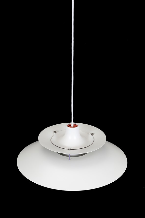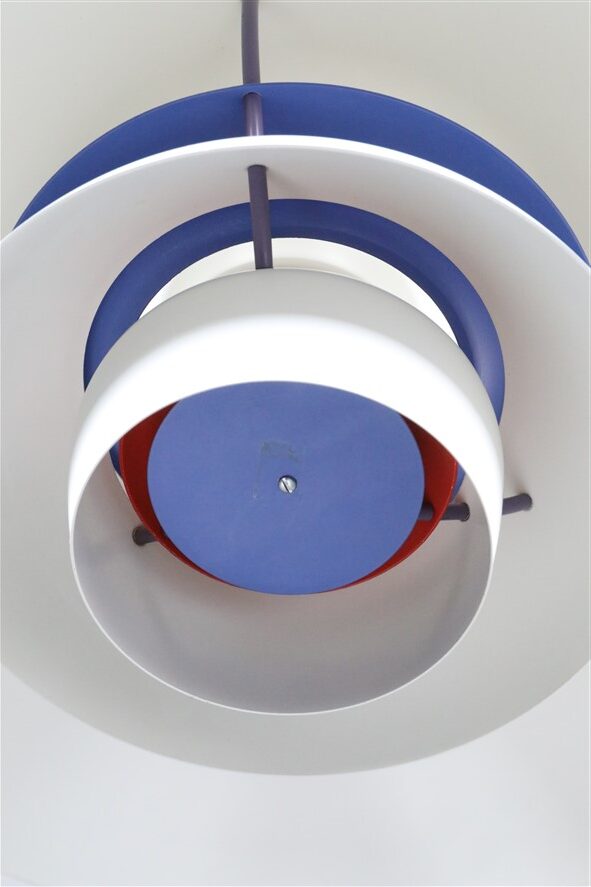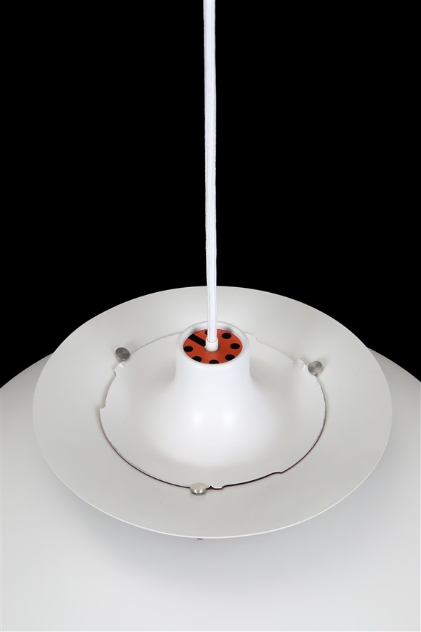 Louis Poulsen “PH 5″ (keine Mini-Version!). Entwurf: Poul Henningsen, 1958, Dänemark, Aluminium, Stahl. 50cm Durchmesser, Höhe ca. 25cm. Ältere Version: siehe orange-farbene Abschluss-Scheibe von oben. Die Lampe eignet sich für den Gebrauch mit klassischen und modernen (LED) E27-Glühbirnen. Kommt inklusive ca. 2,40m hochwertigem, weichem Textilkabel, LED-Glühbirne in warmweiß (Mit dem Smartphone dimmbar. Funktioniert aber auch ohne Smartphone.), Baldachin und Zugentlaster zum Aufhängen. An einer kleinen Stelle unter dem Haupt-Lampenschirm etwas Lackabrieb (siehe Nahaufnahme). An einer Stelle am Rand des Haupt-Lampenschirms leichte Unebenheiten (siehe Nahaufnahme). Beides ist wenig auffällig. Keine Kratzer, keine Defekte, keine Nikotin-Rückstände oder -Gerüche. Aufwändig gesäubert. Dies sind die Original-Fotos der zum Verkauf stehenden Artikel. Trotzdem können die Farben leicht variieren, da sie auf verschiedenen Geräten / Bildschirmen unterschiedlich dargestellt werden.