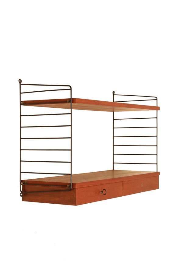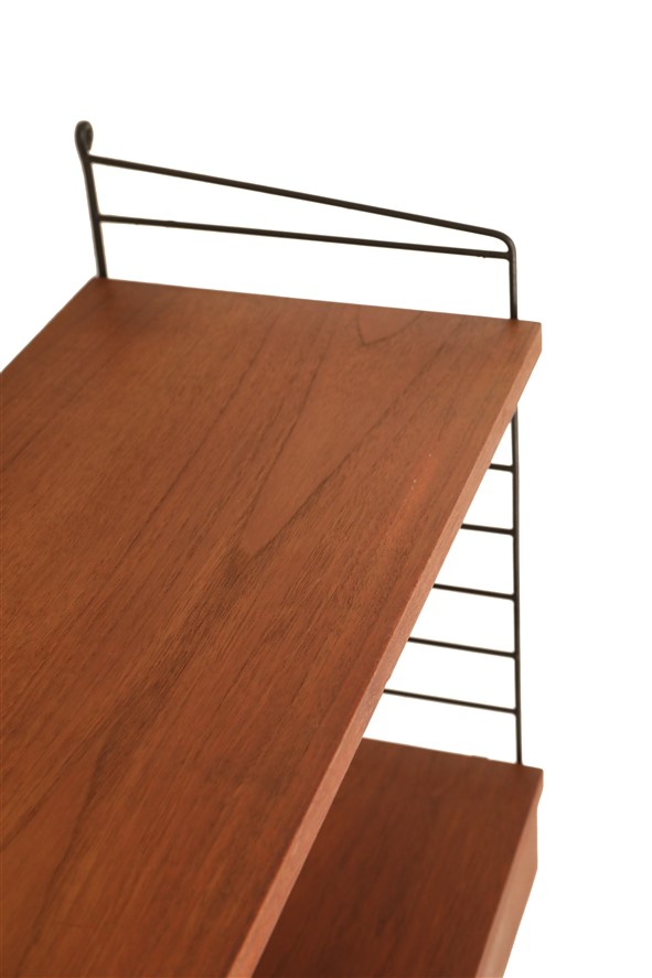 Original „String“ wall shelf / shelving unit, design: Kajsa & Nisse Strinning, 1949, Sweden, teak veneer with real wood core (high quality 1st generation version). Approx. 80x54x30cm (w,h,d).