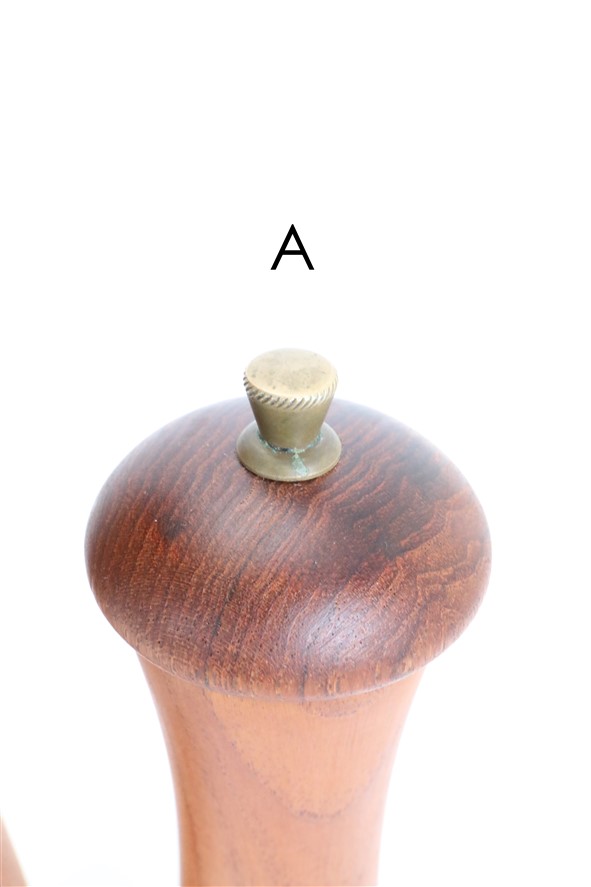 Version A: 1960er-Jahre, Tre Spade, Italien, massives Teakholz. Maße: ca. 21 x 5,5cm (Höhe, Durchmesser). Angenehme, geschmeidig-seidenmatte Holzoberfläche. Trotz des Alters sehr guter Zustand. Nur leichte Gebrauchsspuren.