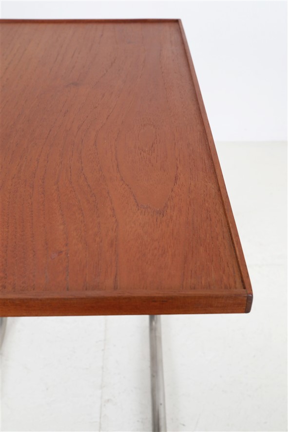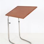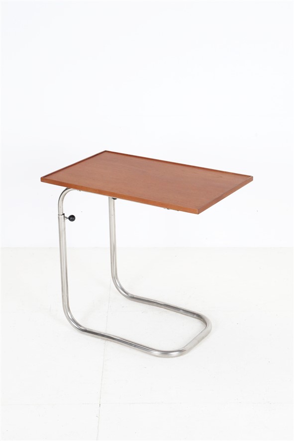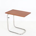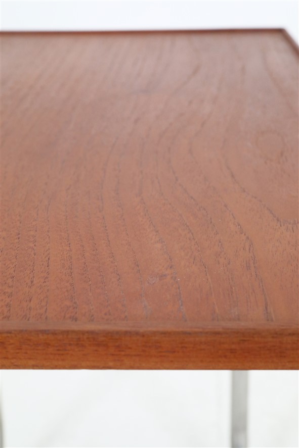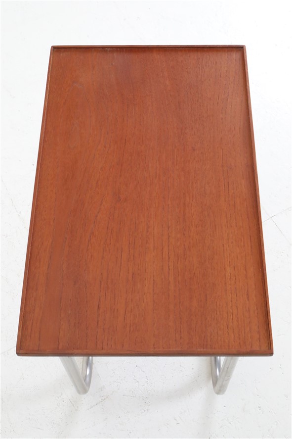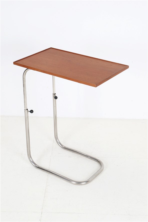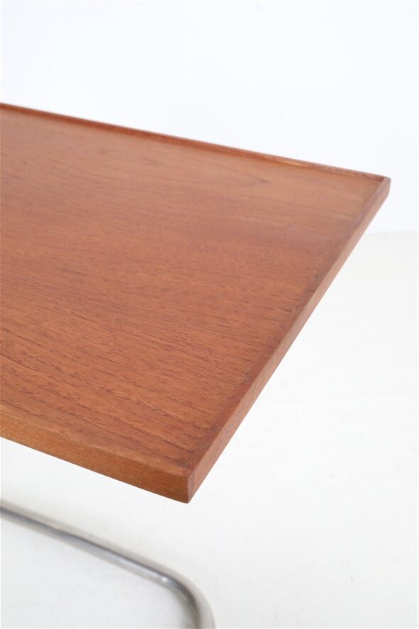 1960er-/1970er-Jahre, Dänemark. Beistelltisch / Lesetisch. Auch geeignet, um am Laptop zu arbeiten. Der Fuß kann zum Beispiel unter eine Couch oder ein Bett geschoben werden. Teak (Furnier und massive Seitenteile), verchromter Stahlrohr-Unterbau. Gesamtmaße: ca. 63 x 39cm (Breite, Tiefe). Höhe verstellbar: ca. 60-80cm (kugelförmige Bakelit-Verstellknöpfe). Gebrauchtware. Voll funktionsfähig. Die Tischplatte wurde professionell restauriert und versiegelt. Geschmeidig-seidenmatte Oberfläche. Nur leichte Gebrauchsspuren, keine Defekte. Die Chrom-Oberfläche ist noch sehr gut. Dies sind die Original-Fotos der zum Verkauf stehenden Artikel. Trotzdem können die Farben leicht variieren, da sie auf verschiedenen Geräten / Bildschirmen unterschiedlich dargestellt werden.