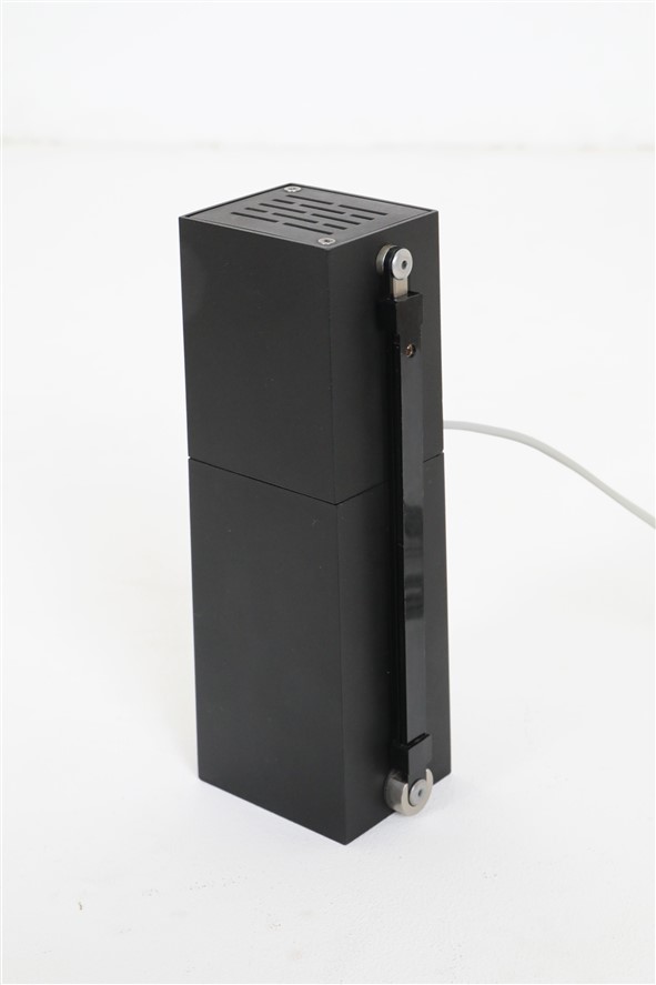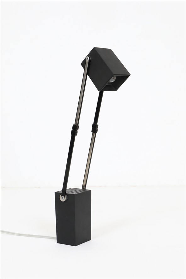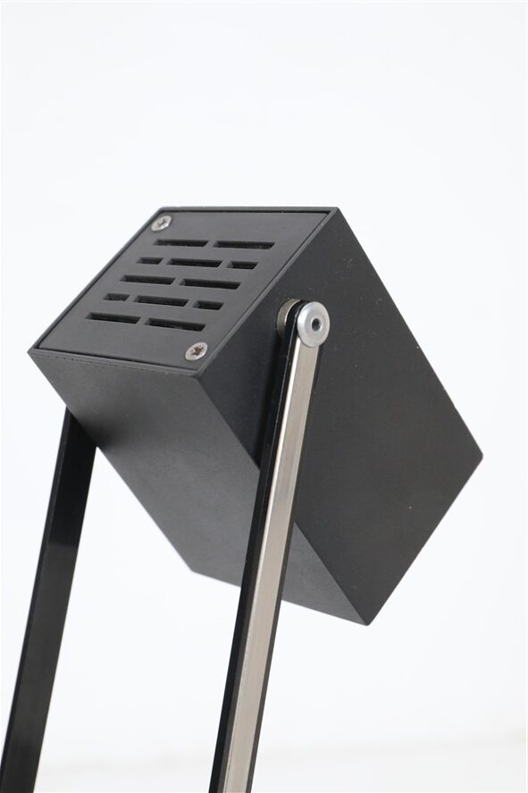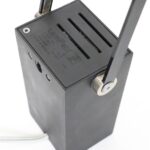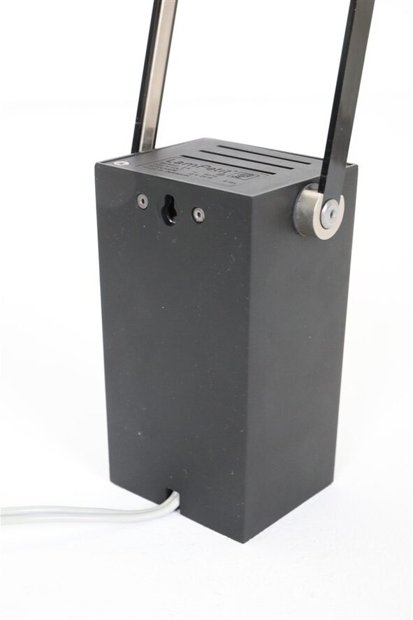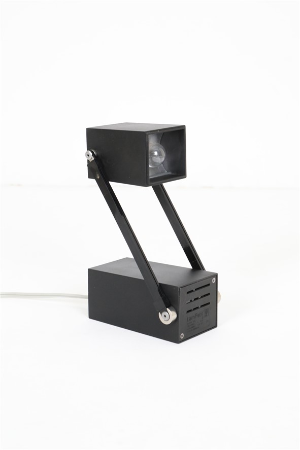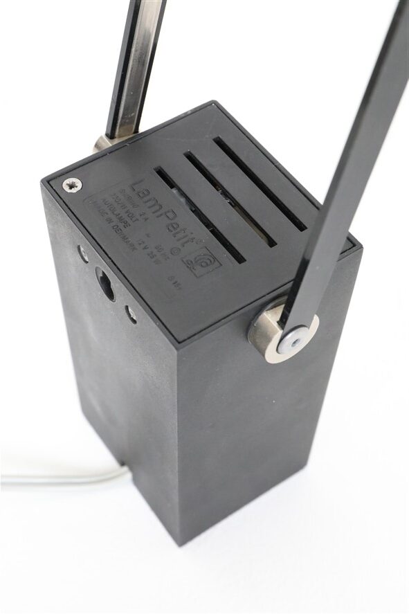 Louis Poulsen „Lampetit“ Tischleuchte / Schreibtischleuchte / Wandleuchte. Design: Bent Gantzel-Boysen, 1966, Dänemark. Farbe: Schwarz. Materialien: Kunststoff, Stahl. Edles mattes Finish. Kompaktes Design mit Teleskop-Armen. Mit eingebautem 12-V-Netztrafo und zweistufigem Schalter. Funktioniert mit handelsüblichen PKW-Glühbirnen. Der dänische Stecker ist durch einen Euro-Stecker ausgetauscht worden, so dass diese Leuchte zum Beispiel auch in Deutschland betrieben werden kann. Diese Lampe kann auch einfach an einer Wand befestigt werden. Maße, wenn ausgefaltet: ca. 38 x 12 x 8cm (Höhe, Breite, Tiefe). Gebrauchtware. Nur leichte altersbedingte Gebrauchsspuren. Siehe Fotos. Keine Defekte. Dies sind die Original-Fotos der zum Verkauf stehenden Artikel. Trotzdem können die Farben leicht variieren, da sie auf verschiedenen Geräten / Bildschirmen unterschiedlich dargestellt werden.