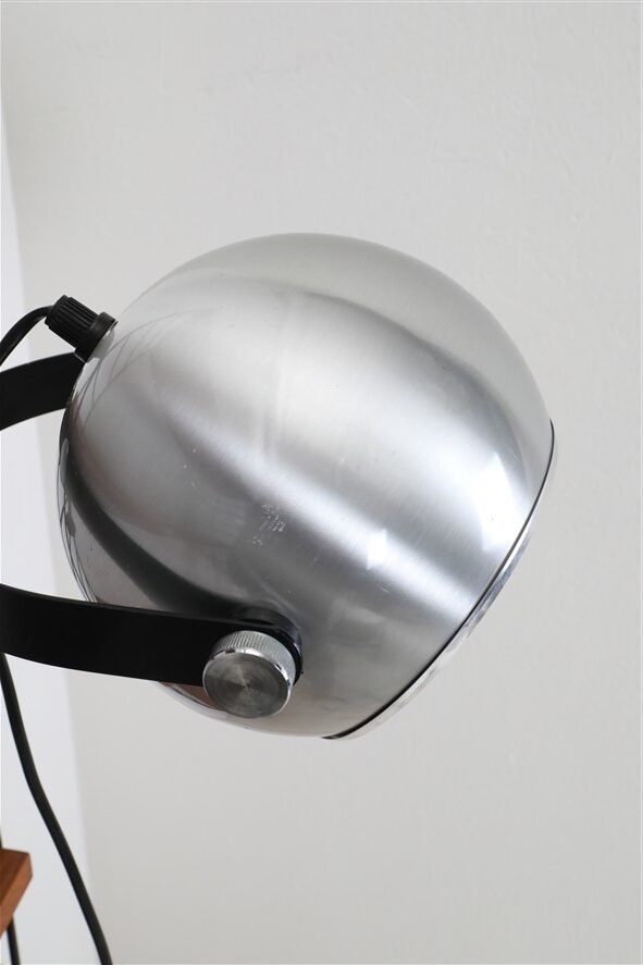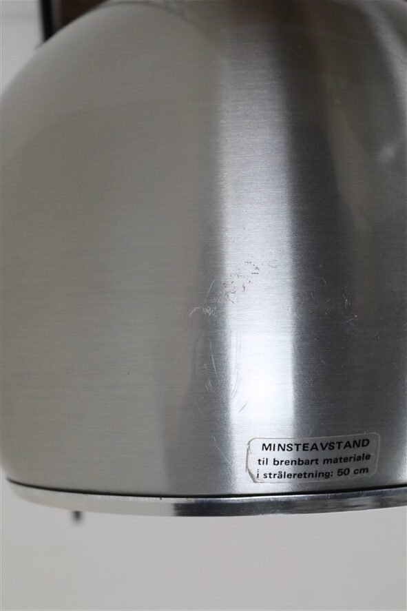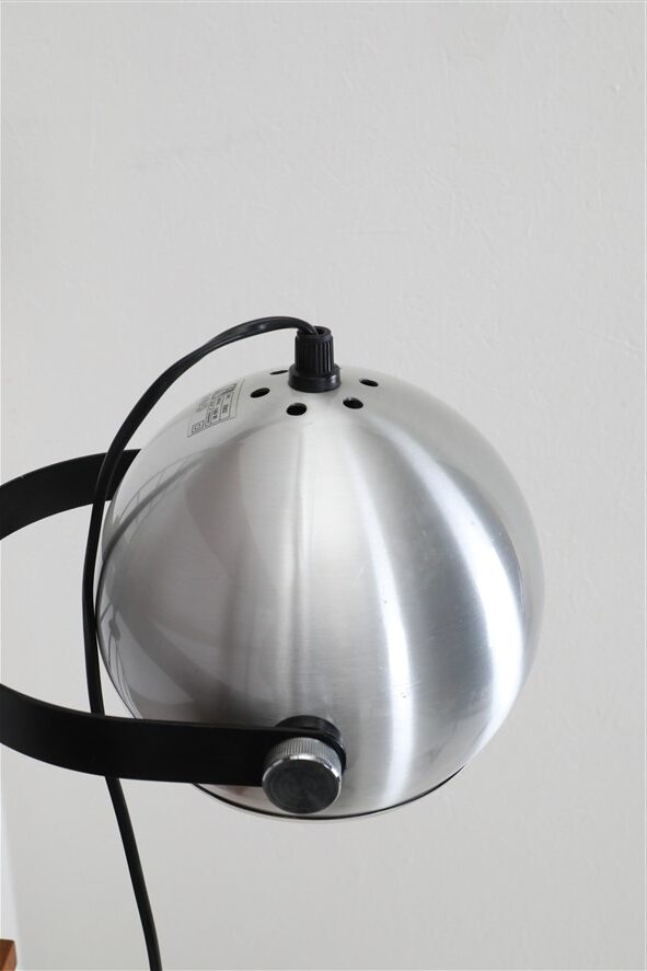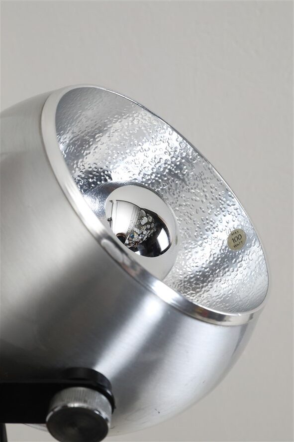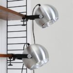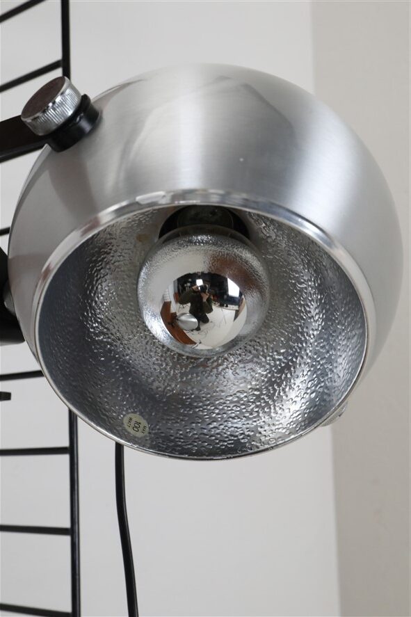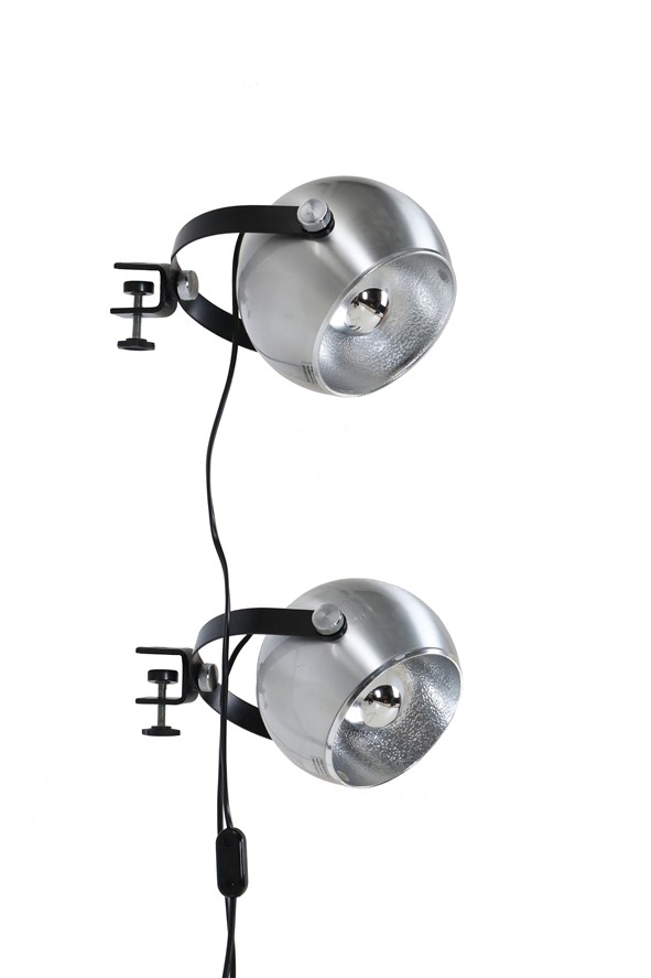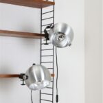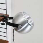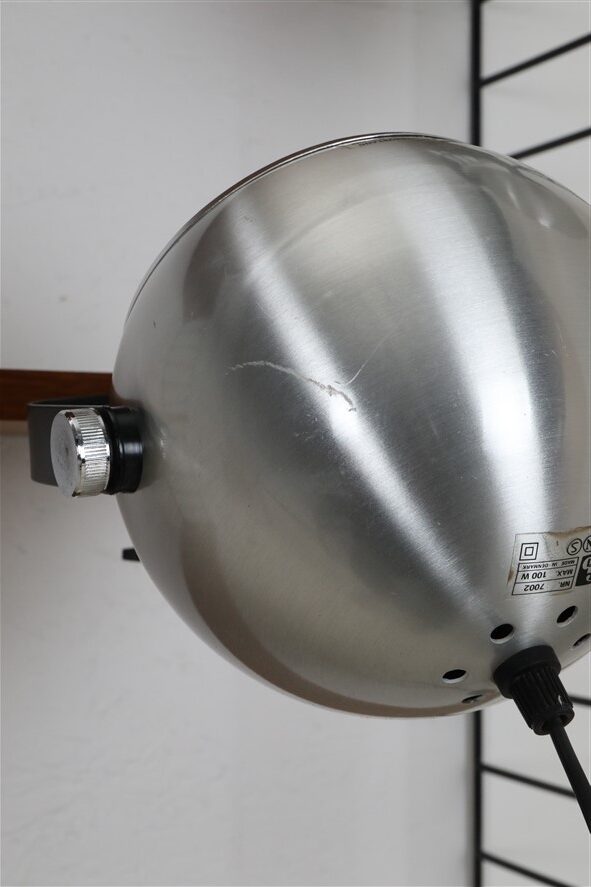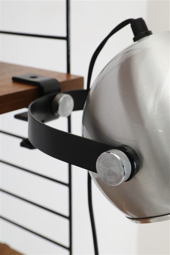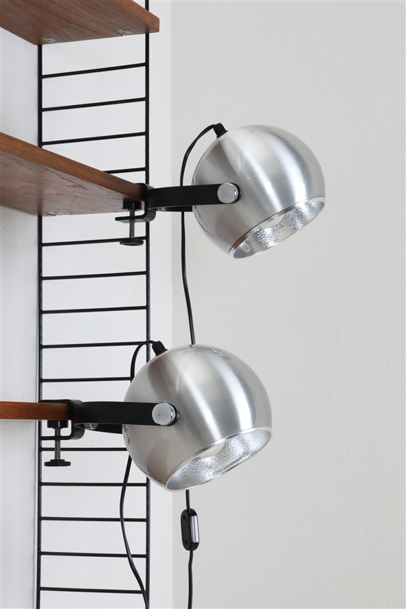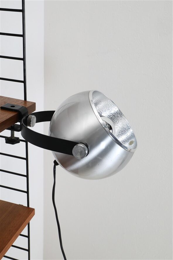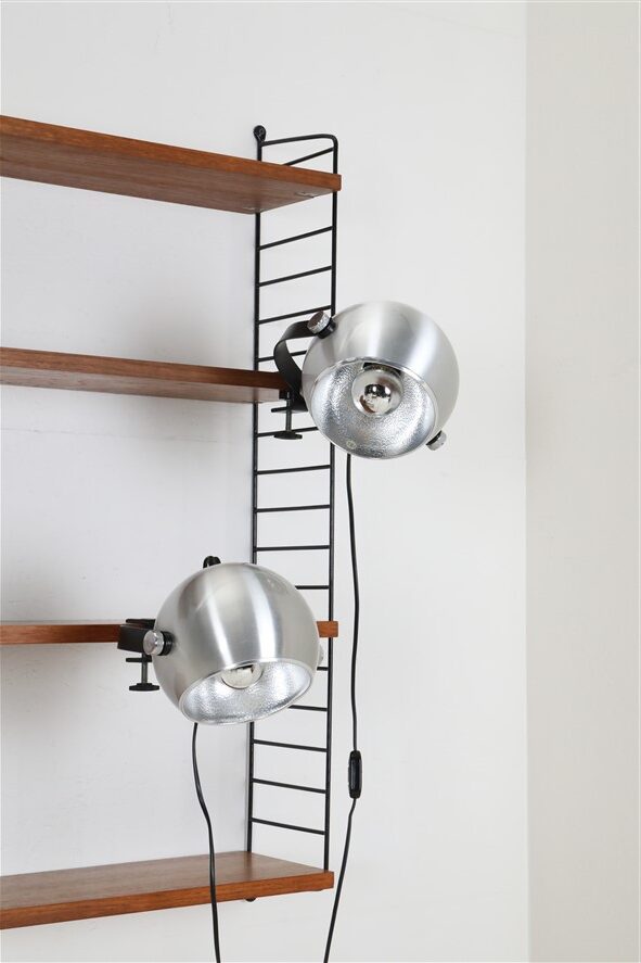 Seltener Space Age Klemmspot “7002”, Design: Claus Bolby, 1975, für CeBo Dänemark. Gebürstetes Aluminium, Stahl. Eignet sich sehr gut zum Anbringen an Regalsysteme (Regalböden sollten dazu befestigt / mit Gewicht belastet werden). E27-Fassung (110-250V, weltweit anwendbar), Schnurschalter (Design: Achille Castiglioni) und Euro-Stecker. Kommt mit energiesparender LED-Kopfspiegelbirne in warmweiß. Maße: ca. 16 x 21 x 30cm (Höhe, Breite, Tiefe). Gebrauchtware. Keine Defekte. Nur leichte Gebrauchsspuren in Form von ein paar eher unauffälligen, oberflächlichen Kratzern. Siehe Nahaufnahmen. Das mit abgebildete String-Regal ist nicht Bestandteil dieses Angebotes. Dies sind die Originalbilder der zum Verkauf stehenden Artikel. Trotzdem können die Farben leicht variieren, da sie auf verschiedenen Geräten / Bildschirmen unterschiedlich dargestellt werden.