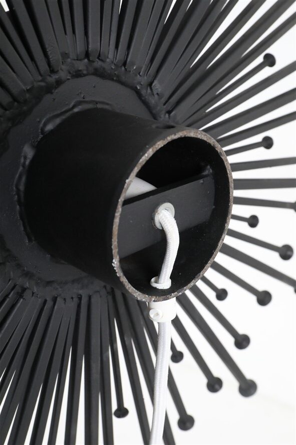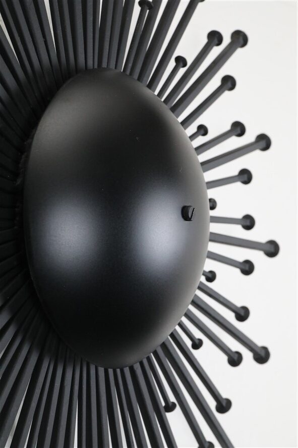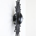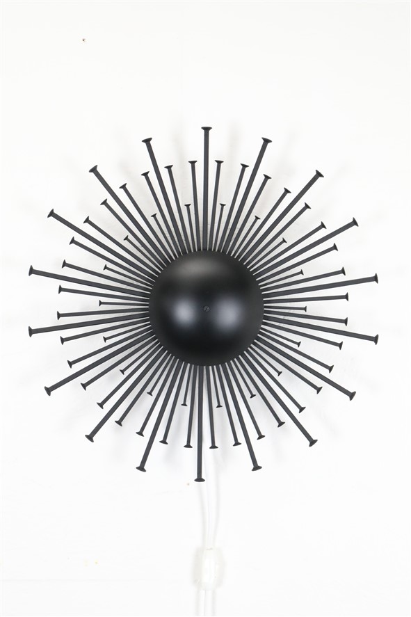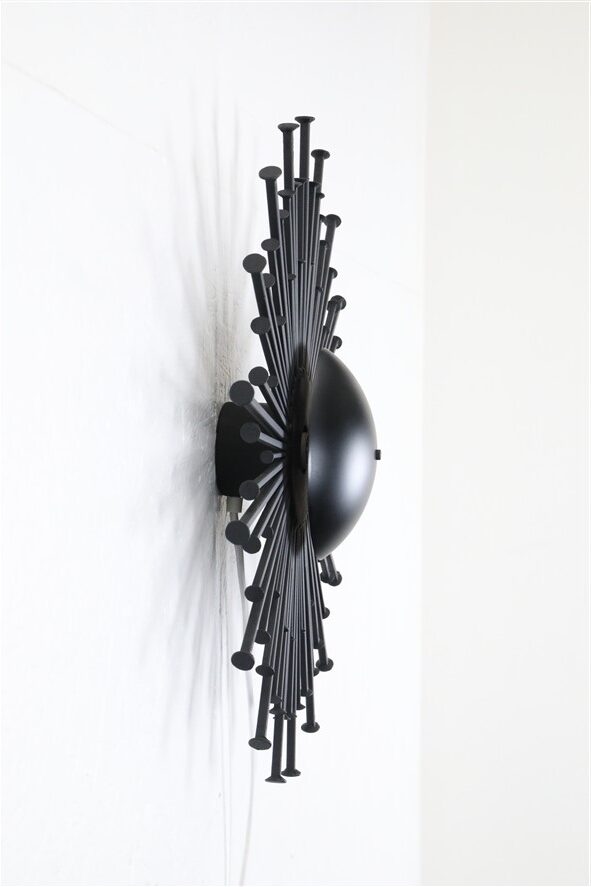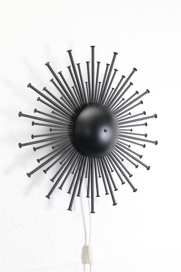 1960er-Jahre, Dantoft, Dänemark. Sehr seltene schwarze Sunburst-Wandleuchte in besonders großer Ausführung. Die größte, die ich je hatte. Handgearbeitete Stahl-Konstruktion. Schwere Qualität. Diese Wandleuchten werden, wie auch andere Metallskulpturen des Herstellers Dantoft, von vielen Händlern/Sammlern dem Designer Svend Aage Holm Sørensen zugeschrieben. Es gibt meines Wissens aber keine Belege, die diese Zuschreibungen untermauern. Wie auch immer. Dieses Stück ist eher eine Lichtskulptur als eine Lichtquelle. Sie erzeugt nicht allzu viel Licht, aber in einem ansonsten dunklen Raum wirkt der Schattenwurf an der Wand spektakulär (siehe Fotos). E14-Fassung (110-250V, weltweit anwendbar). Kommt mit Schnurschalter, Textilkabel (ca. 240cm) und europäischem Stecker. Diese Leuchte lässt sich (durch eine Elektro-Fachkraft) auch an einen Wand-Kabelausgang anschließen. Maße: ca. 52cm Durchmesser, ca. 13cm Tiefe. Gebrauchtware. Sehr gut erhalten. Lackierung professionell erneuert. Nur minimale Alterungs- und Gebrauchsspuren. Siehe Fotos. Dies sind die Originalbilder der zum Verkauf stehenden Artikel.