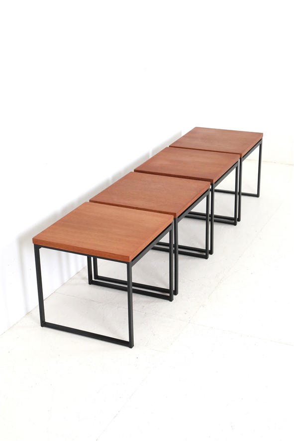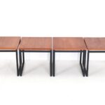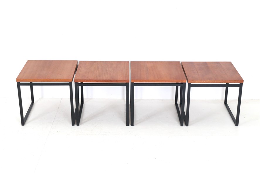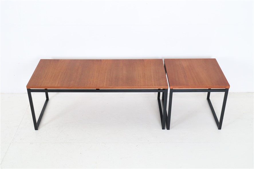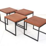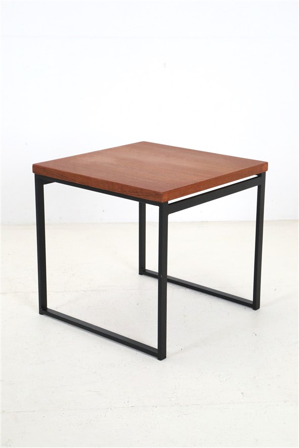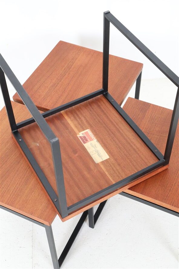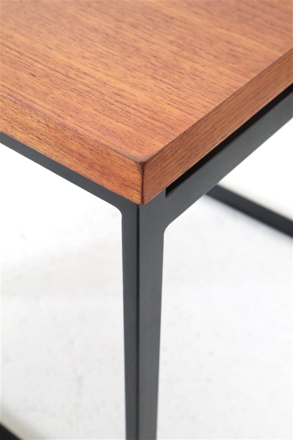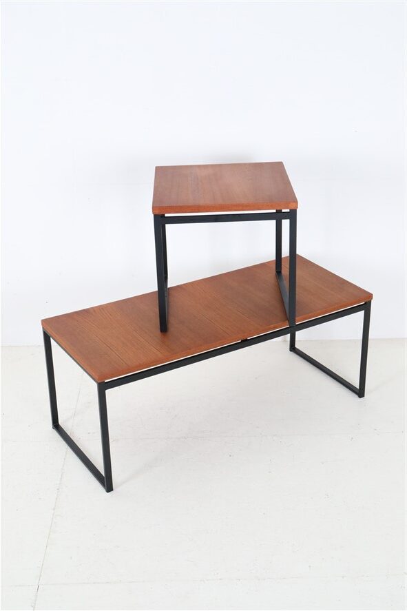 Seltene Beistelltische aus der “Twen”-Serie von Rego. Design: Günter Renkel, um 1957. Deutschland (west). Leicht wirkender, sachlich-zeitloser Entwurf. Ein gutes Beispiel des west-deutschen Mid Century Modernismus. Teak-Furnier, originales Stahl-Gestell in schwarz. Maße: ca. 40x40x38cm (Breite, Tiefe, Höhe). Komplett restauriert. Seidenmattes Finish, angenehme Haptik. Gebrauchtware. Sehr guter Zustand. Nur wenige Gebrauchsspuren und kleine Furnierausbesserungen (KEINE Anwendung von Wachs!). Siehe Nahaufnahmen. Dies sind die Original-Fotos der zum Verkauf stehenden Artikel. Trotzdem können die Farben leicht variieren, da sie auf verschiedenen Geräten / Bildschirmen unterschiedlich dargestellt werden. Der mit abgebildete größere Couchtisch auf den letzten beiden Fotos ist nicht Bestandteil dieses Angebots und kann zusätzlich erworben werden (solange verfügbar).