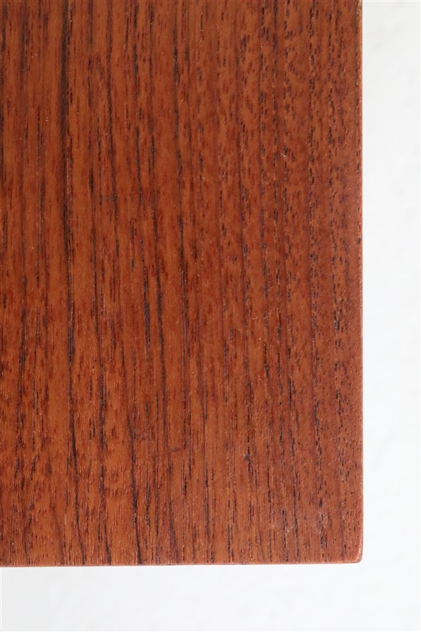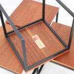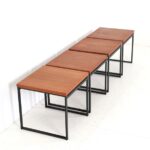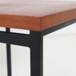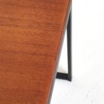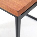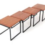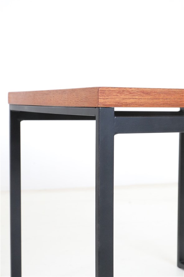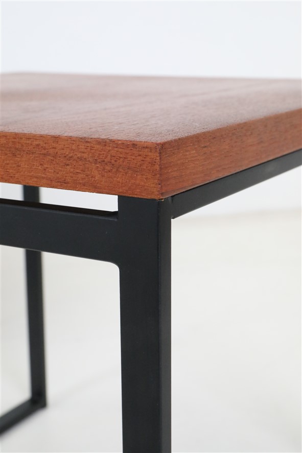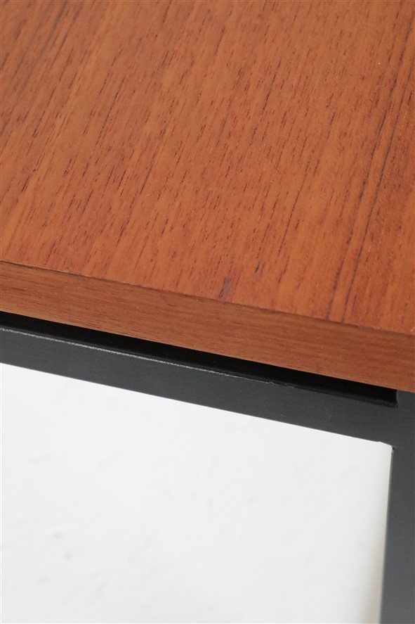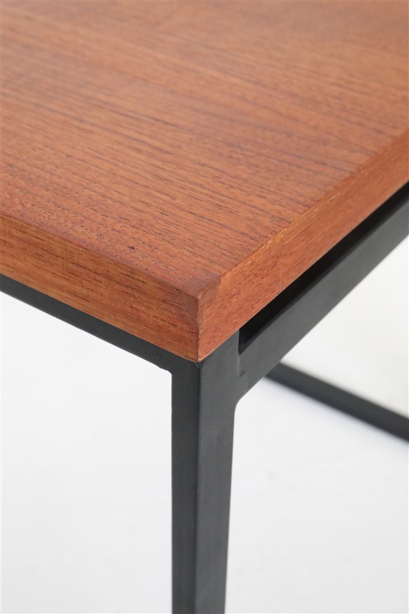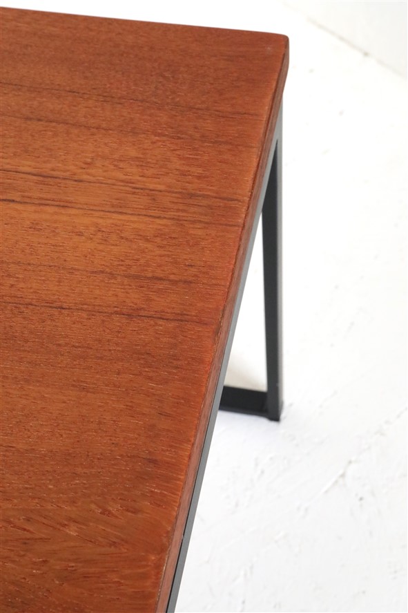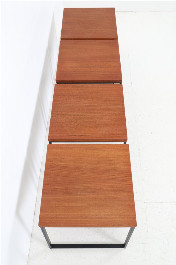 Seltene Beistelltische aus der “Twen”-Serie von Rego. Design: Günter Renkel, um 1957. Deutschland (west). Leicht wirkender, sachlich-zeitloser Entwurf. Ein gutes Beispiel des west-deutschen Mid Century Modernismus. Teak-Furnier, originales Stahl-Gestell in schwarz. Maße: ca. 40x40x38cm (Breite, Tiefe, Höhe). Komplett restauriert. Seidenmattes Finish, angenehme Haptik. Gebrauchtware. Sehr guter Zustand. Nur wenige Gebrauchsspuren und kleine Furnierausbesserungen (KEINE Anwendung von Wachs!). Siehe Nahaufnahmen. Dies sind die Original-Fotos der zum Verkauf stehenden Artikel. Trotzdem können die Farben leicht variieren, da sie auf verschiedenen Geräten / Bildschirmen unterschiedlich dargestellt werden. Der mit abgebildete größere Couchtisch auf den letzten beiden Fotos ist nicht Bestandteil dieses Angebots und kann zusätzlich erworben werden (solange verfügbar).