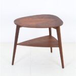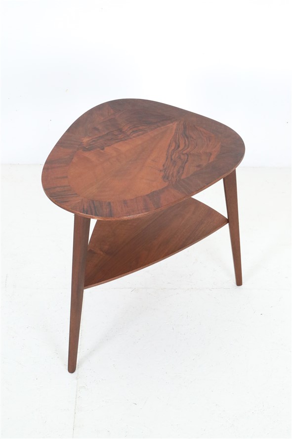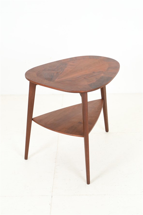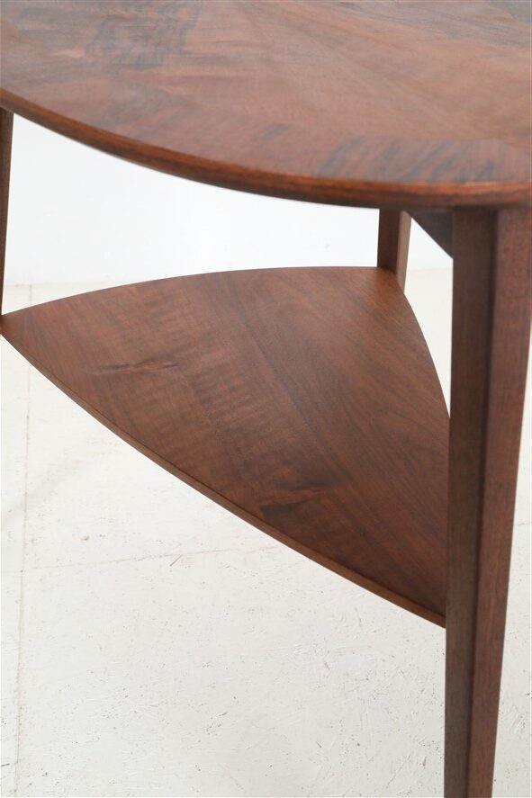 1950er-1960er Jahre, Dänemark. Design: Holger Georg Jensen, für Kubus. „Modell 11“. Walnuss (Furnier und Massivteile). In dieser Holzart besonders selten. Gesamtmaße: ca. 49x51x44cm (Höhe, Breite, Tiefe). Außergewöhnliche Handwerkskunst. Besonders das Furnier auf der Haupt-Tischplatte! Restauriert. Geschliffen, hochwertige Hartölversiegelung. Seidenmatte Oberflächen. Angenehme Haptik. Sieht nicht nur gut aus. Fühlt sich auch gut an. Gebrauchtware, aber nur wenige Gebrauchsspuren. Siehe Fotos. Die Farben können variieren, da jedes Gerät/Display die Farben anders darstellt.