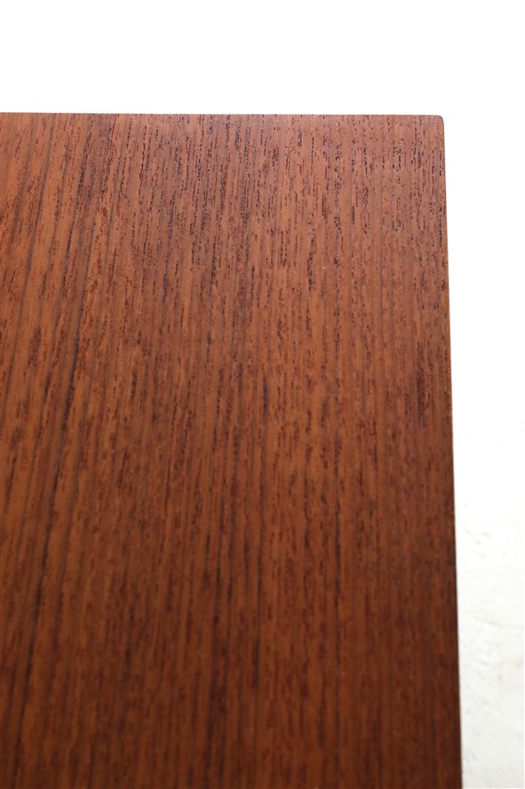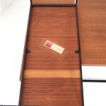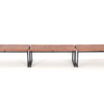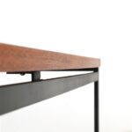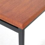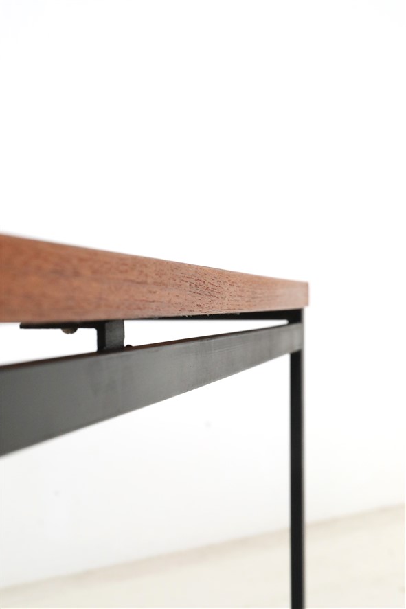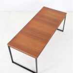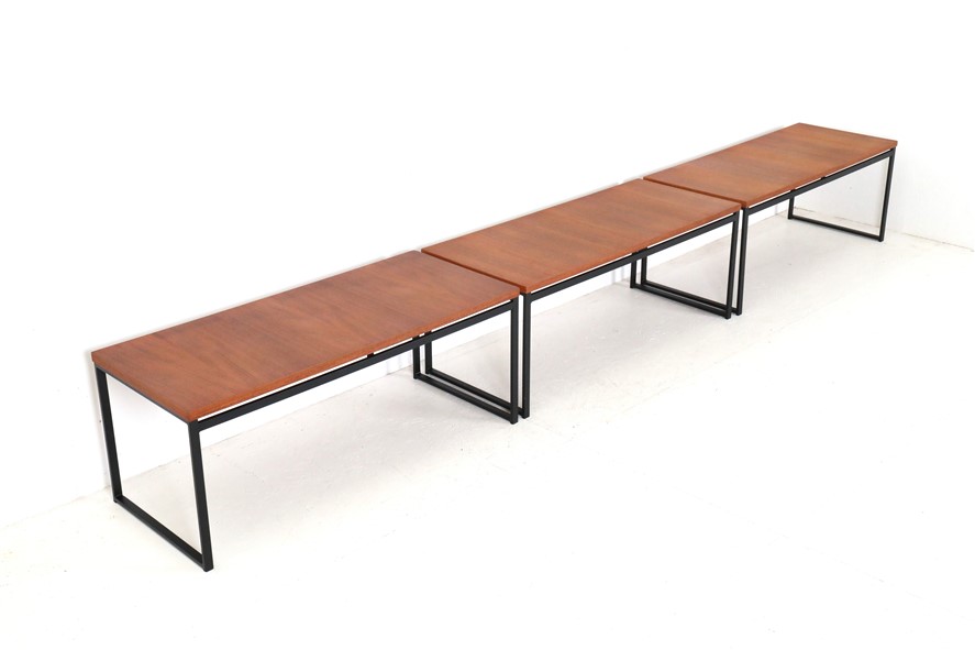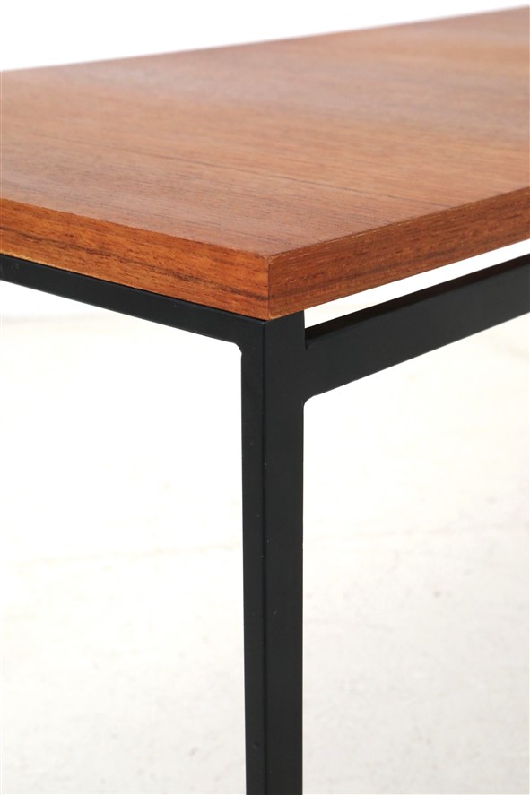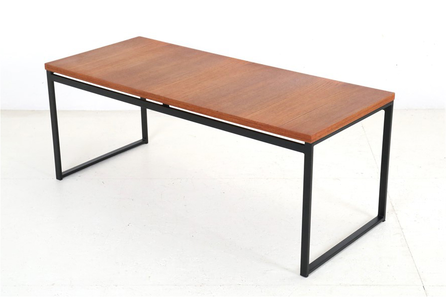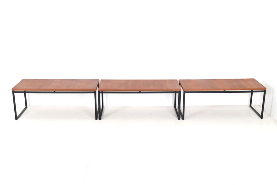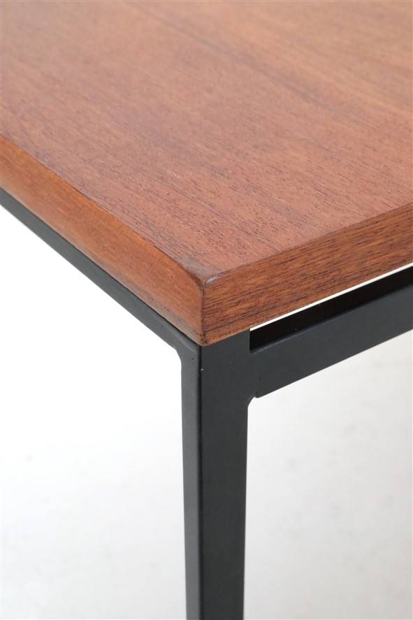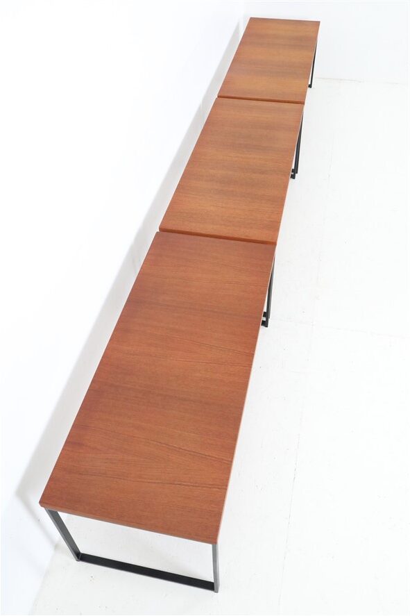 Seltene Couchtische aus der “Twen”-Serie von Rego. Design: Günter Renkel, um 1957. Deutschland (west). Leicht wirkender, sachlich-zeitloser Entwurf. Ein gutes Beispiel des west-deutschen Mid Century Modernismus. Teak-Furnier, originales Stahl-Gestell in schwarz. Maße: ca. 95x40x38cm (Breite, Tiefe, Höhe). Komplett restauriert. Seidenmattes Finish, angenehme Haptik. Gebrauchtware. Sehr guter Zustand. Nur wenige Gebrauchsspuren und kleine Furnierausbesserungen (KEINE Anwendung von Wachs!). Siehe Nahaufnahmen. Dies sind die Original-Fotos der zum Verkauf stehenden Artikel. Trotzdem können die Farben leicht variieren, da sie auf verschiedenen Geräten / Bildschirmen unterschiedlich dargestellt werden. Der mit abgebildete kleinere Beistelltisch auf den letzten beiden Fotos ist nicht Bestandteil dieses Angebots und kann zusätzlich erworben werden (solange verfügbar).