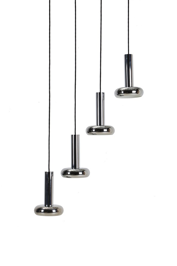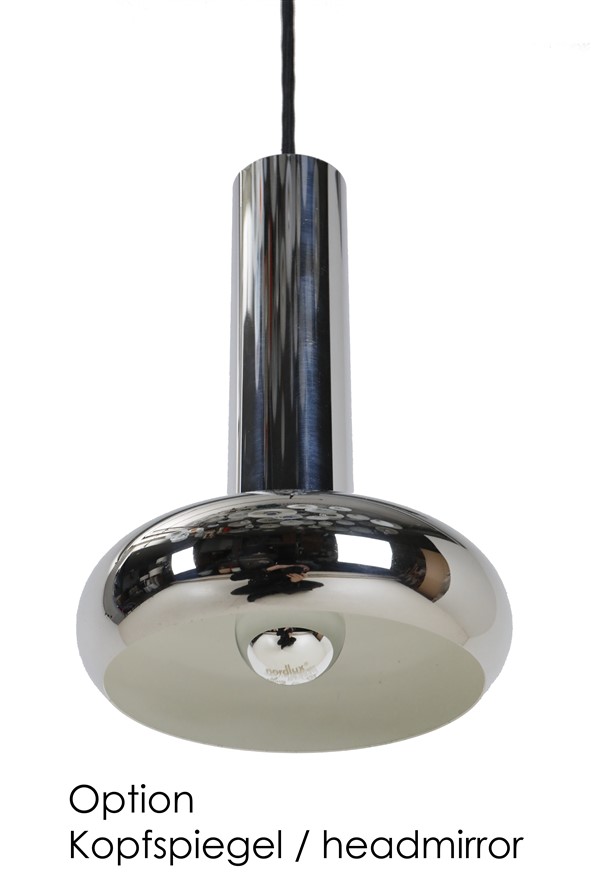 Space Age Hängeleuchten aus den 1960er/1970er-Jahren. Aus West-Deutschland. Könnten von Staff oder Hillebrand sein. Ich habe abe keinen Sticker gefunden. Stahl, verchromt. Maße jeweils ca. 25x18cm (Höhe, Durchmesser). Hochwertige E27-Fassung aus Stahl und Keramik (110-250V, weltweit anwendbar). Die Lampe eignet sich für den Gebrauch mit klassischen und modernen (LED) Glühbirnen. Jede Leuchte kommt inklusive ca. 2,30m hochwertigem, weichem Textilkabel, energiesparender LED-Glühbirne in warmweiß, Zugentlaster zur Deckenmontage und Baldachin. Gebrauchtware. Keine Defekte. Trotz des Alters nur leichte Gebrauchsspuren. Stellenweise etwas Patina. Siehe Nahaufnahmen. Dies sind die Originalfotos der zum Verkauf stehenden Artikel. Trotzdem können die Farben leicht variieren, da sie auf verschiedenen Geräten / Bildschirmen unterschiedlich dargestellt werden.